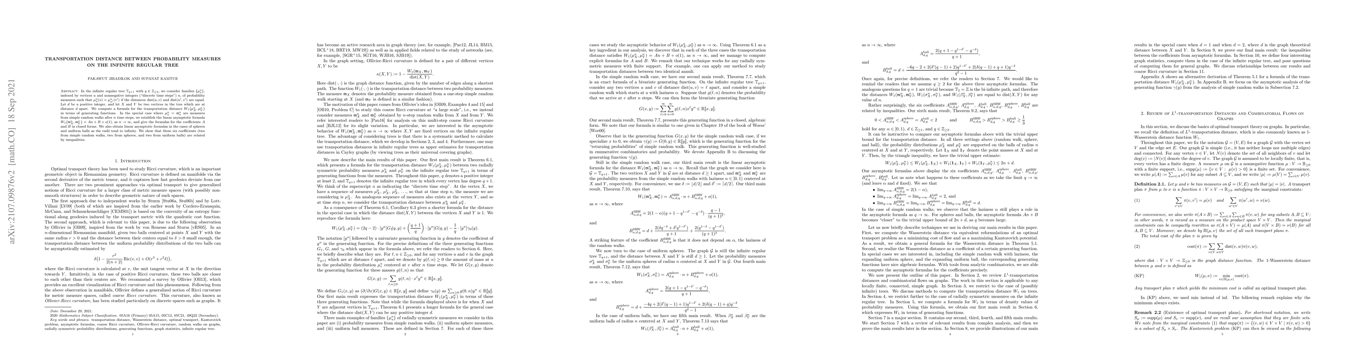 In the infinite regular tree $\mathbb{T}_{q+1}$ with $q \in \mathbb{Z}_{\ge 2}$, we consider families $\{\mu_u^n\}$, indexed by vertices $u$ and nonnegative integers ("discrete time steps") $n$, of probability measures such that $\mu_u^n(v) = \mu_{u'}^n(v')$ if the distances $\operatorname{dist}(u,v)$ and $\operatorname{dist}(u',v')$ are equal. Let $d$ be a positive integer, and let $X$ and $Y$ be two vertices in the tree which are at distance $d$ apart. We compute a formula for the transportation distance $W_1\!\left( \mu_X^n, \mu_Y^n \right)$ in terms of generating functions. In the special case where $\mu_u^n = \mathfrak{m}_u^n$ are measures from simple random walks after $n$ time steps, we establish the linear asymptotic formula $W_1\!\left( \mathfrak{m}_X^n, \mathfrak{m}_Y^n \right) = An + B + o(1)$, as $n \to \infty$, and give the formulas for the coefficients $A$ and $B$ in closed forms. We also obtain linear asymptotic formulas in the cases of spheres and uniform balls as the radii tend to infinity. We show that these six coefficients (two from simple random walks, two from spheres, and two from uniform balls) are related by inequalities.