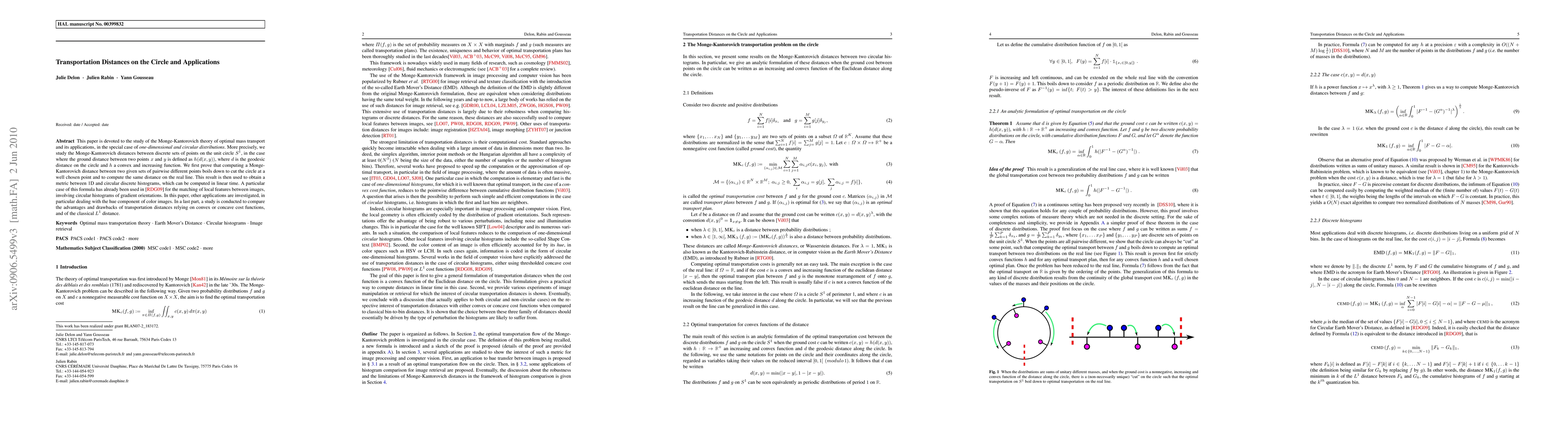 This paper is devoted to the study of the Monge-Kantorovich theory of optimal mass transport and its applications, in the special case of one-dimensional and circular distributions. More precisely, we study the Monge-Kantorovich distances between discrete sets of points on the unit circle, in the case where the ground distance between two points x and y is defined as h(d(x,y)), where d is the geodesic distance on the circle and h a convex and increasing function. We first prove that computing a Monge-Kantorovich distance between two given sets of pairwise different points boils down to cut the circle at a well chosen point and to compute the same distance on the real line. This result is then used to obtain a metric between 1D and circular discrete histograms, which can be computed in linear time. A particular case of this formula has already been used in [Rabin, Delon and Gousseau SIAM 09}] for the matching of local features between images, involving circular histograms of gradient orientations. In this paper, other applications are investigated, in particular dealing with the hue component of color images. In a last part, a study is conducted to compare the advantages and drawbacks of transportation distances relying on convex or concave cost functions, and of the classical L-1 distance.