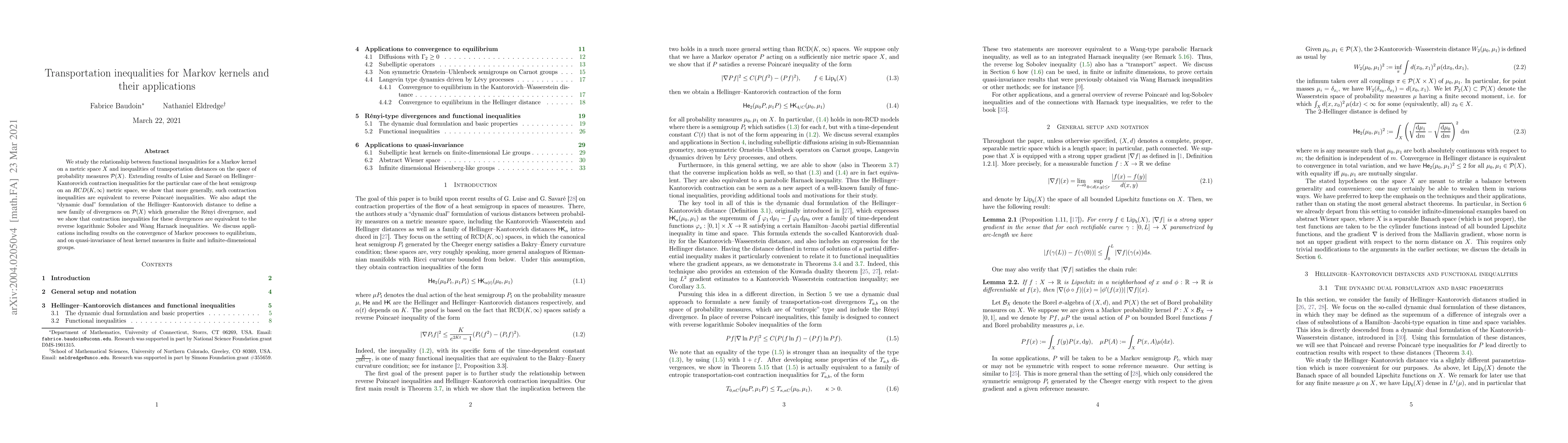 This paper explores the equivalence between functional inequalities for Markov kernels and transportation distance inequalities, showing that contraction inequalities correspond to reverse Poincaré inequalities. It introduces a new family of divergences generalizing the Rényi divergence and discusses applications in Markov processes' convergence and quasi-invariance of heat kernel measures.