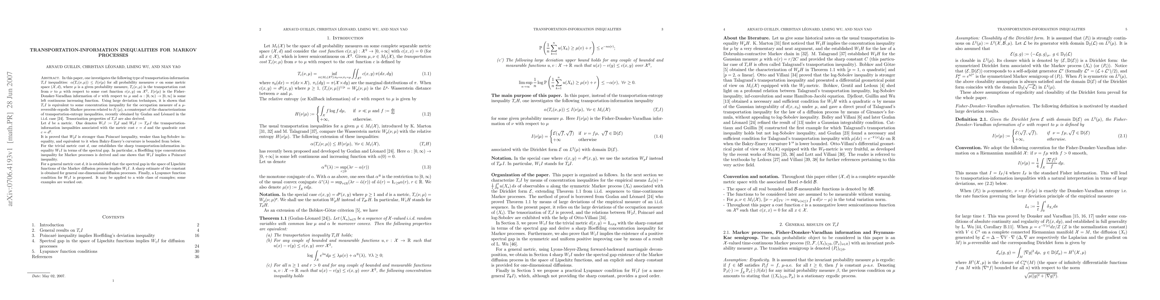 This paper explores transportation-information inequalities for Markov processes, establishing that $\alpha(T_c(\nu,\mu)) \le I(\nu|\mu)$ using large deviation techniques. It shows these inequalities are equivalent to concentration inequalities for the occupation measure of a $\mu$-reversible ergodic Markov process.