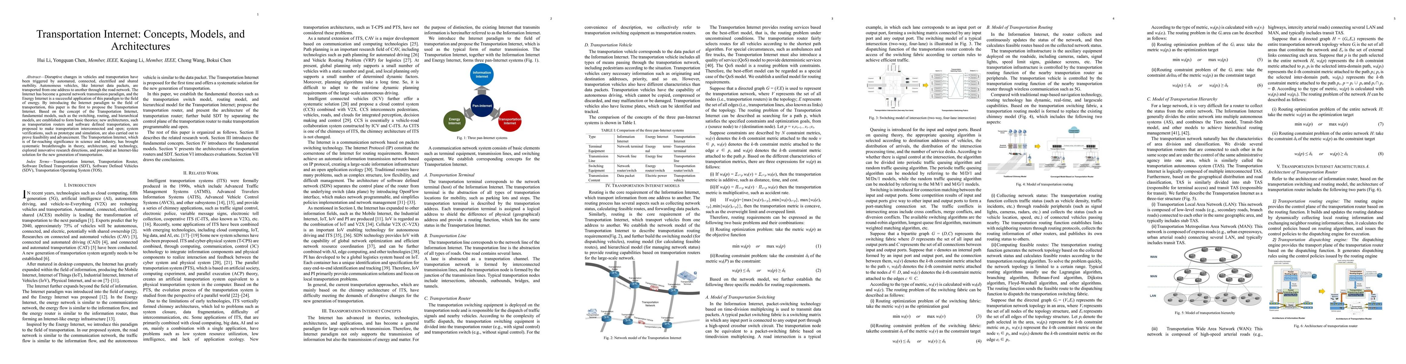 The Transportation Internet proposes a network paradigm for transportation, introducing models, architectures, and system verifications to make transportation interconnected and open. This concept has brought systematic breakthroughs in theory, architecture, and technology for the new generation of transportation.