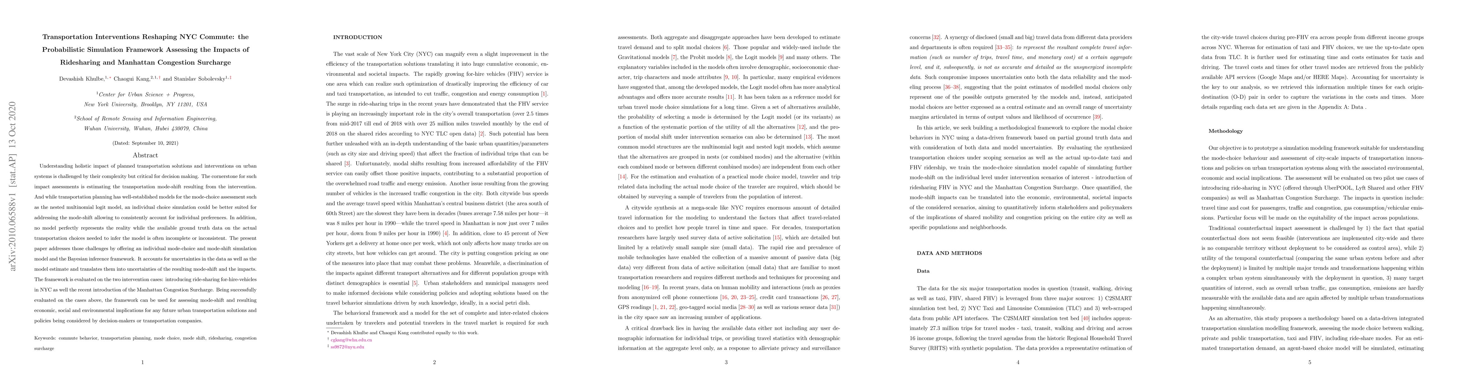 This paper proposes a probabilistic simulation framework for assessing the impacts of transportation interventions like ridesharing and congestion surcharges in NYC. It evaluates mode-shifts using a Bayesian inference method that accounts for data and model uncertainties, demonstrating its effectiveness through case studies of ridesharing and congestion pricing.