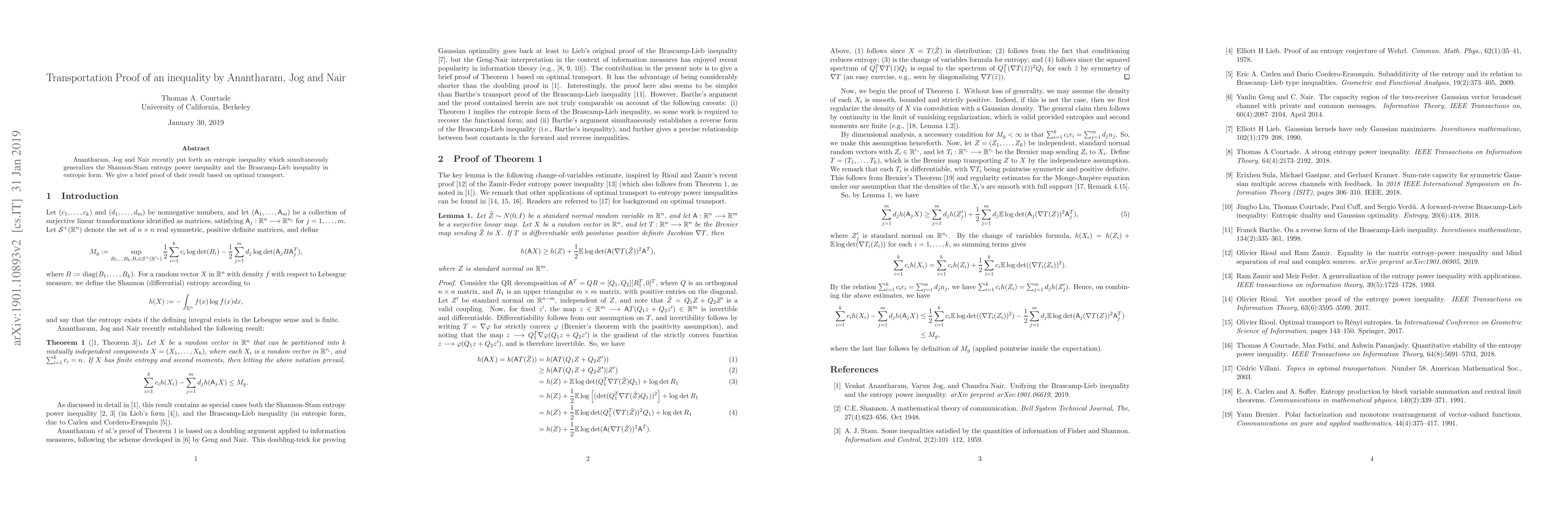 Summary: Anantharam, Jog, and Nair present an entropic inequality that generalizes both the Shannon-Stam entropy power inequality and the Brascamp-Lieb inequality. The paper provides a concise proof of this result using optimal transport techniques.