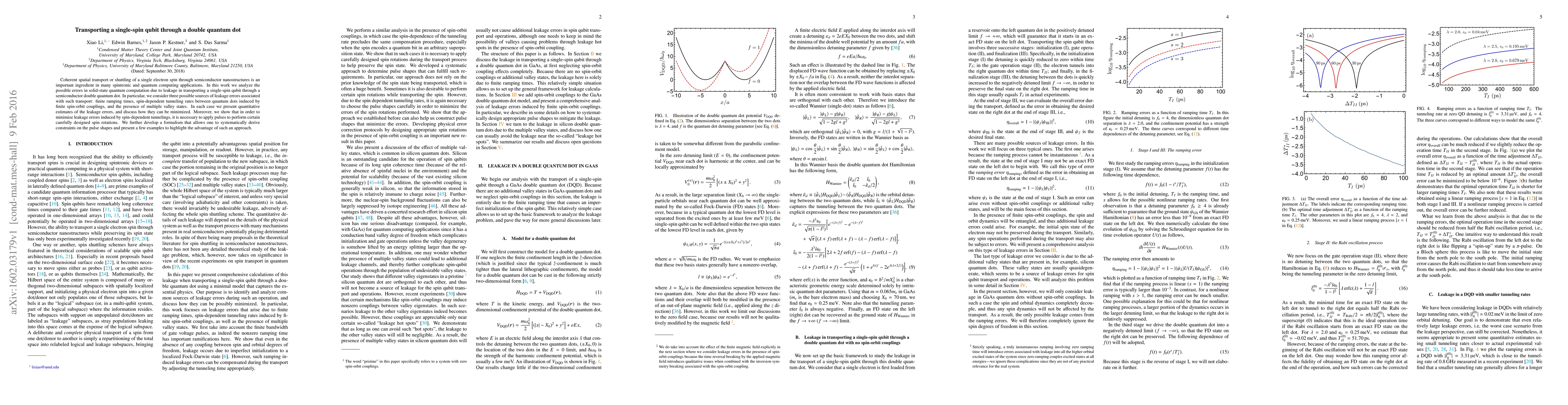 This paper investigates the coherent transport of a single-spin qubit through a semiconductor double quantum dot, identifying and quantifying leakage errors due to finite ramping times, spin-dependent tunneling, and multiple valley states. It proposes methods to minimize these errors, including carefully designed pulse rotations, and develops a formalism to derive constraints on pulse shapes.
