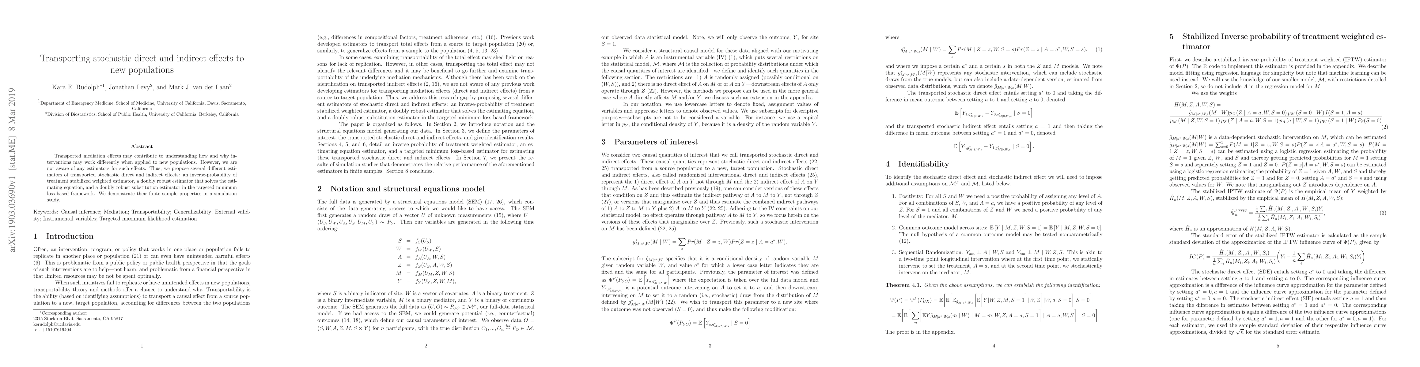 Transported mediation effects may contribute to understanding how and why interventions may work differently when applied to new populations. However, we are not aware of any estimators for such effects. Thus, we propose several different estimators of transported stochastic direct and indirect effects: an inverse-probability of treatment stabilized weighted estimator, a doubly robust estimator that solves the estimating equation, and a doubly robust substitution estimator in the targeted minimum loss-based framework. We demonstrate their finite sample properties in a simulation study.
