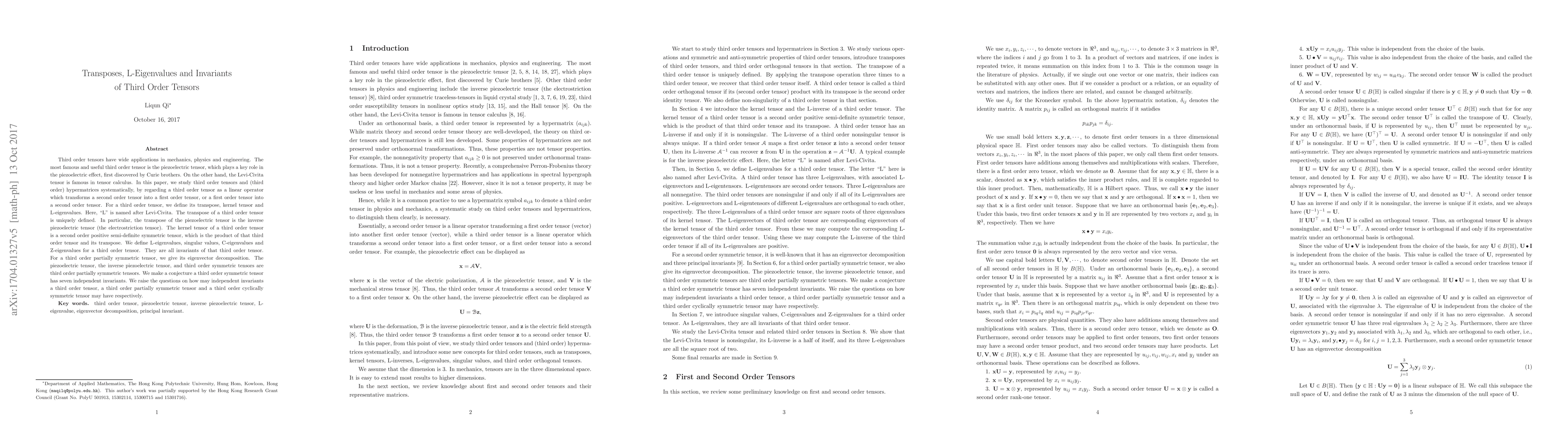 This paper systematically explores third order tensors, defining their transpose, kernel tensor, and L-eigenvalues, and introduces invariants such as L-eigenvalues, singular values, C-eigenvalues, and Z-eigenvalues. It conjectures that third order symmetric tensors have seven independent invariants and poses questions regarding the number of independent invariants for third order partially symmetric and cyclically symmetric tensors.