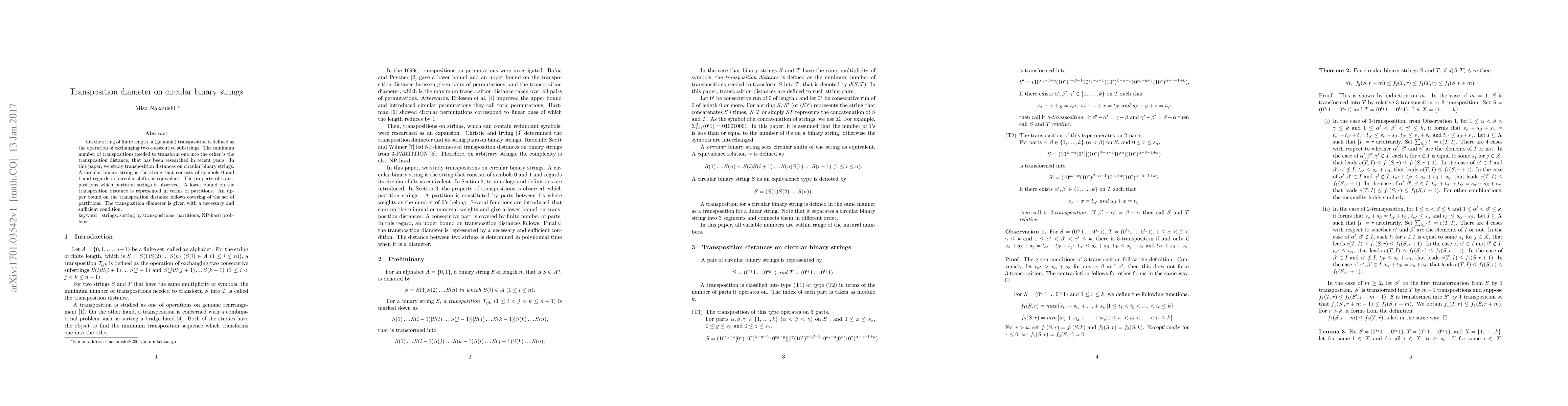 This paper investigates the transposition distance on circular binary strings, where transpositions involve swapping consecutive substrings. It establishes a lower bound for the transposition distance based on string partitions and provides an upper bound through the coverage of partition sets, ultimately defining the transposition diameter with a necessary and sufficient condition.