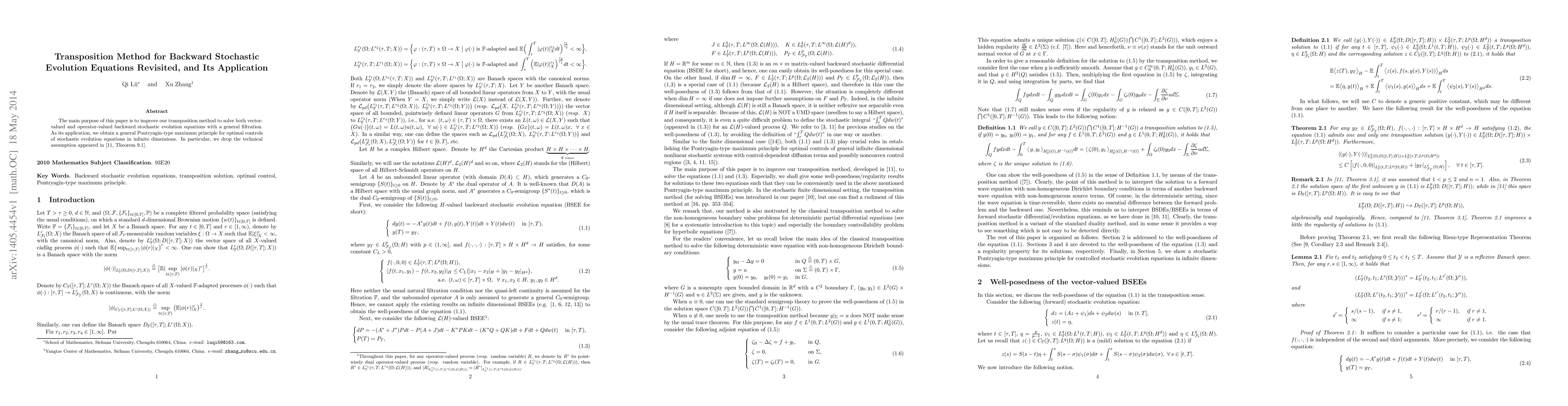 This paper refines the transposition method for solving vector-valued and operator-valued backward stochastic evolution equations under a general filtration. It also establishes a general Pontryagin-type maximum principle for optimal controls in stochastic infinite-dimensional systems, removing a technical assumption from previous work.