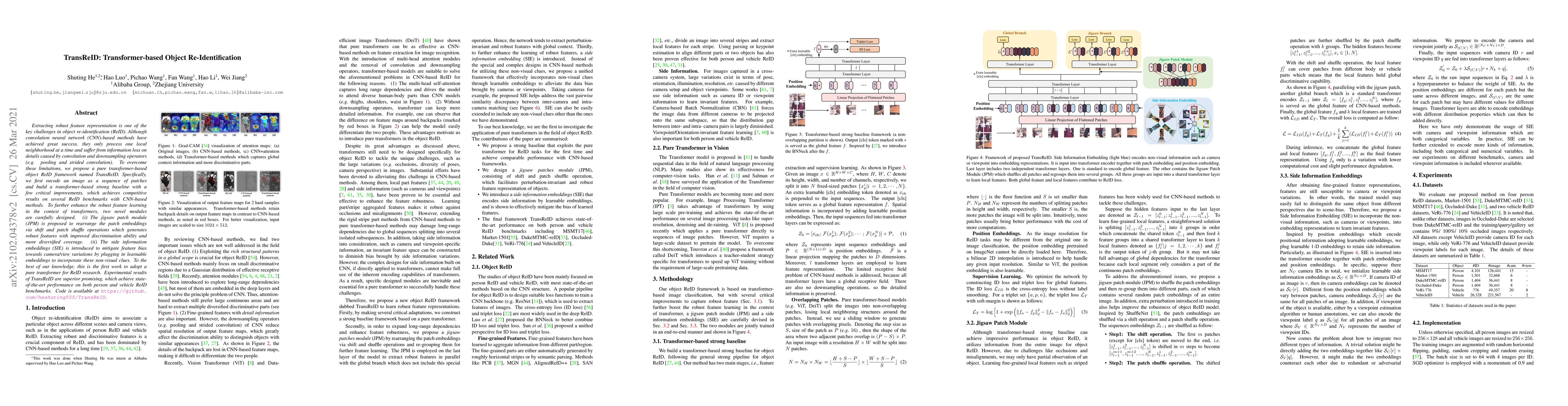 TransReID introduces a transformer-based framework for object re-identification, addressing limitations of CNN-based methods by encoding images into patches and employing novel modules to enhance feature learning. The proposed method achieves state-of-the-art performance on person and vehicle re-identification benchmarks.