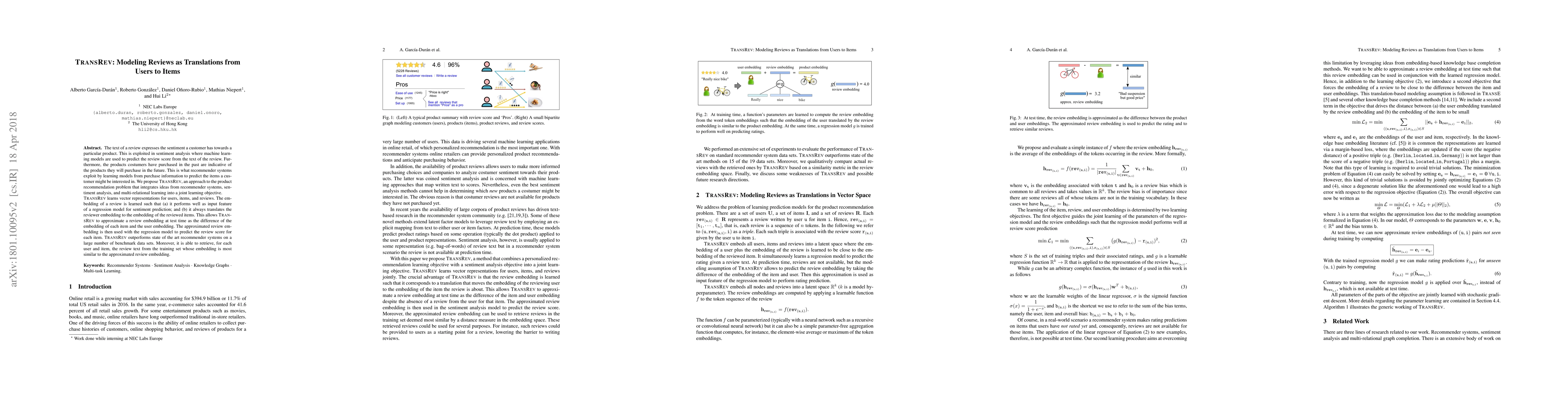 The text of a review expresses the sentiment a customer has towards a particular product. This is exploited in sentiment analysis where machine learning models are used to predict the review score from the text of the review. Furthermore, the products costumers have purchased in the past are indicative of the products they will purchase in the future. This is what recommender systems exploit by learning models from purchase information to predict the items a customer might be interested in. We propose TransRev, an approach to the product recommendation problem that integrates ideas from recommender systems, sentiment analysis, and multi-relational learning into a joint learning objective. TransRev learns vector representations for users, items, and reviews. The embedding of a review is learned such that (a) it performs well as input feature of a regression model for sentiment prediction; and (b) it always translates the reviewer embedding to the embedding of the reviewed items. This allows TransRev to approximate a review embedding at test time as the difference of the embedding of each item and the user embedding. The approximated review embedding is then used with the regression model to predict the review score for each item. TransRev outperforms state of the art recommender systems on a large number of benchmark data sets. Moreover, it is able to retrieve, for each user and item, the review text from the training set whose embedding is most similar to the approximated review embedding.
