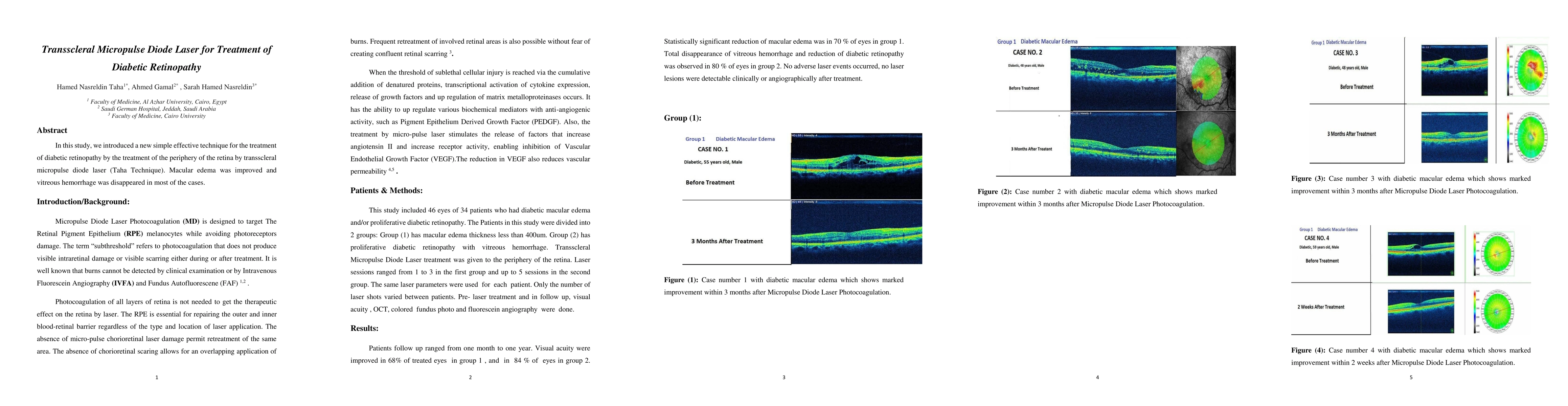 Summary: This study presents a novel transscleral micropulse diode laser technique (Taha Technique) for treating diabetic retinopathy, showing significant improvement in macular edema and resolution of vitreous hemorrhage in most cases.