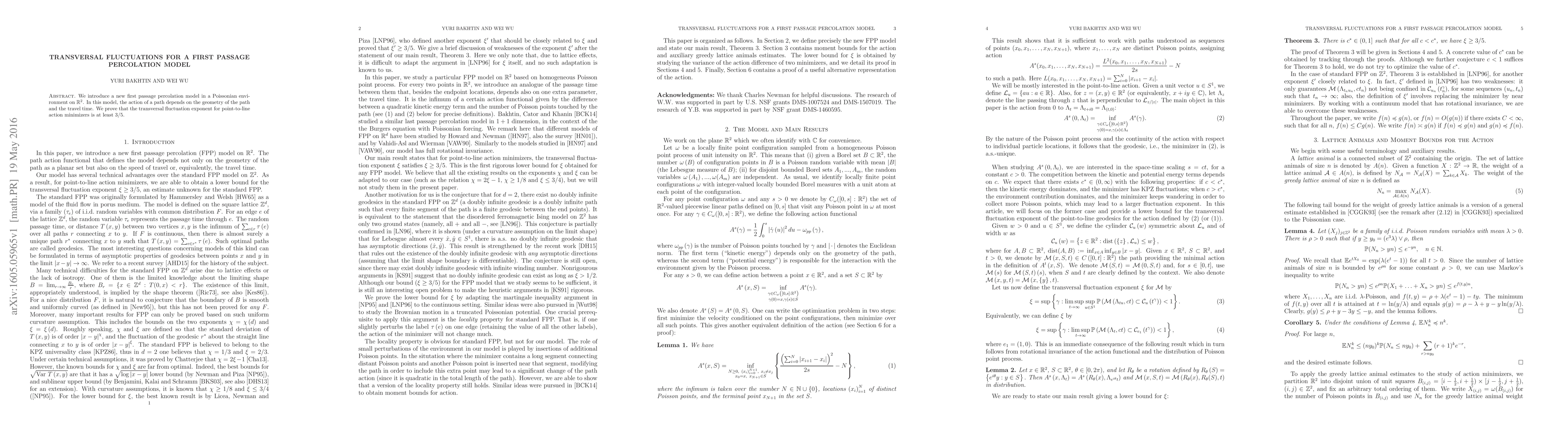 A new first passage percolation model was introduced in a 2D Poissonian environment, and the transversal fluctuation exponent for optimal paths was found to be at least 3/5.