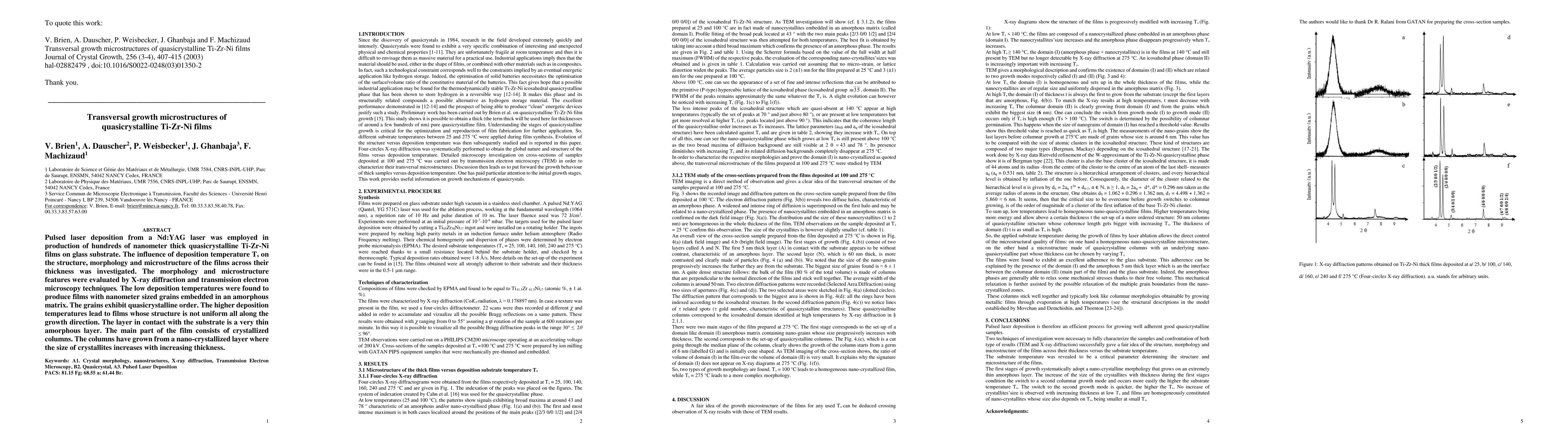 This study investigates quasicrystalline Ti-Zr-Ni films produced via pulsed laser deposition, finding that low temperatures yield nanometer-grained films with quasicrystalline order embedded in an amorphous matrix, while higher temperatures result in films with crystallized columns growing from a nano-crystallized base.