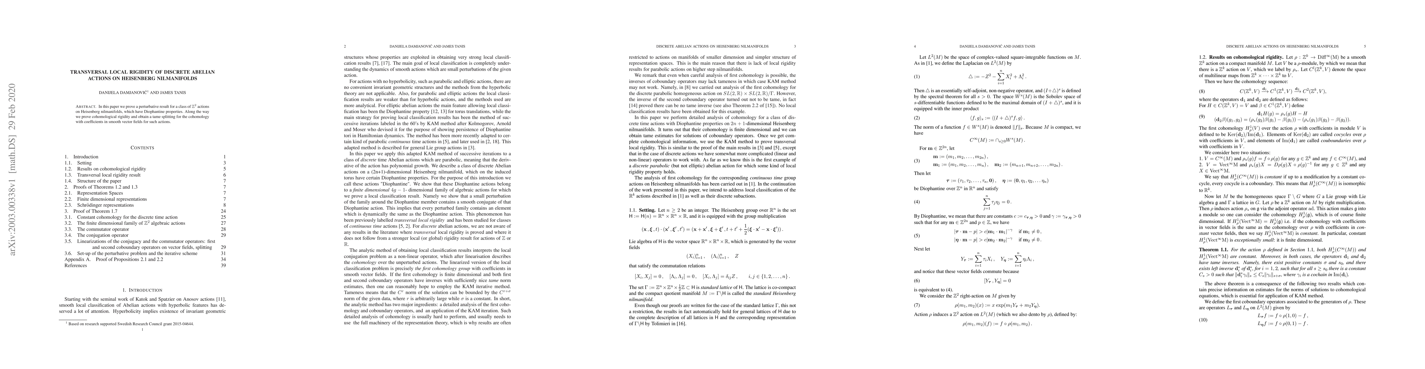This paper establishes transversal local rigidity for $\mathbb Z^2$ actions on Heisenberg nilmanifolds with Diophantine properties, proving cohomological rigidity and a tame splitting for the cohomology with smooth vector fields.