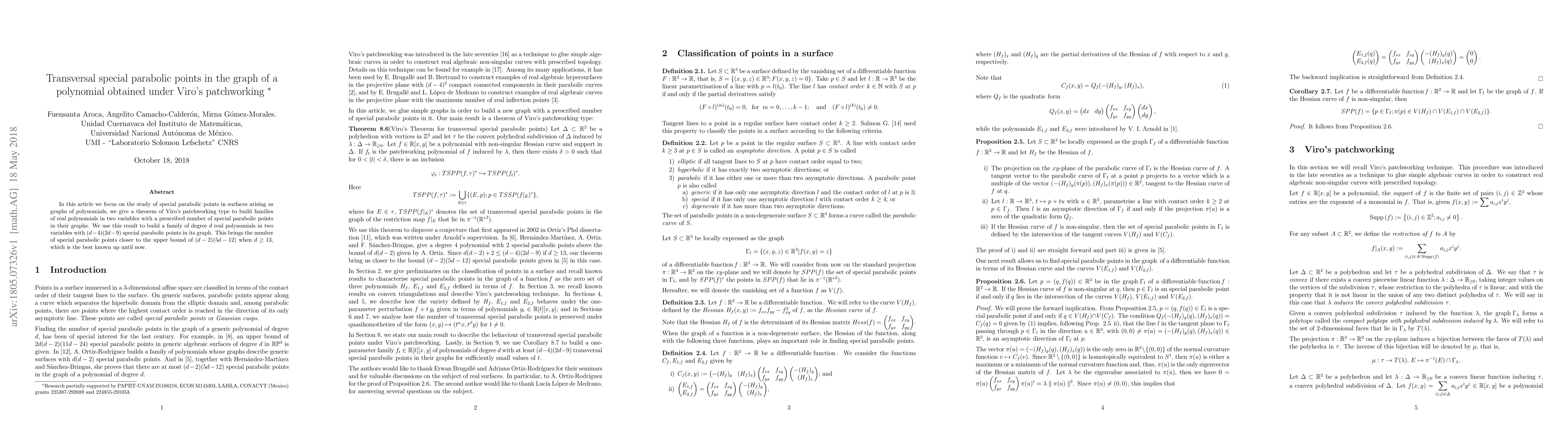 In this article we focus on the study of special parabolic points in surfaces arising as graphs of polynomials, we give a theorem of Viro's patchworking type to build families of real polynomials in two variables with a prescribed number of special parabolic points in their graphs. We use this result to build a family of degree d real polynomials in two variables with $(d-4)(2d-9)$ special parabolic points in its graph. This brings the number of special parabolic points closer to the upper bound of $(d-2)(5d-12)$ when $d \geq 13$, which is the best known up until now.