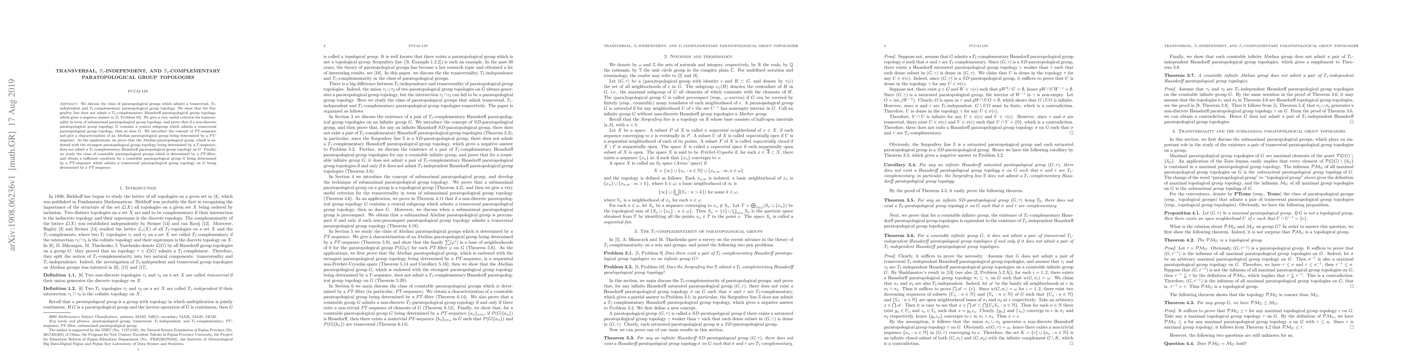 We discuss the class of paratopological groups which admits a transversal, $T_{1}$-independent and $T_{1}$-complementary paratopological group topology. We show that the Sorgenfrey line does not admit a $T_{1}$-complementary Hausdorff paratopological group topology, which gives a negative answer to \cite[Problem 10]{AT2017}. We give a very useful criterion for transversality in term of submaximal paratopological group topology, and prove that if a non-discrete paratopological group topology $G$ contains a central subgroup which admits a transversal paratopological group topology, then so does $G$. We introduce the concept of $PT$-sequence and give a characterization of an Abelian paratopological group being determined by a $PT$-sequence. As the applications, we prove that the Abelian paratopological group, which is endowed with the strongest paratopological group topology being determined by a $T$-sequence, does not admit a $T_{1}$-complementary Hausdorff paratopological group topology on $G$. Finally, we study the class of countable paratopological groups which is determined by a $PT$-filter, and obtain a sufficient condition for a countable paratopological group $G$ being determined by a $PT$-sequence which admits a transversal paratopological group topology on $G$ being determined by a $PT$-sequence.