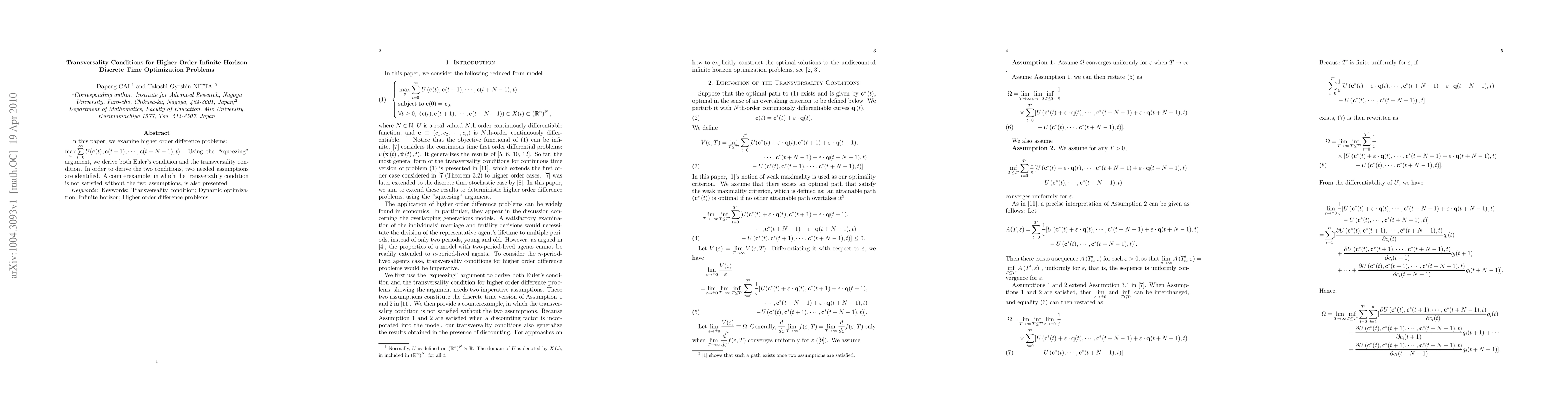 This paper derives Euler's condition and a transversality condition for higher order infinite horizon discrete time optimization problems using the "squeezing" argument. It identifies two critical assumptions necessary for these derivations and provides a counterexample illustrating the failure of the transversality condition without these assumptions.