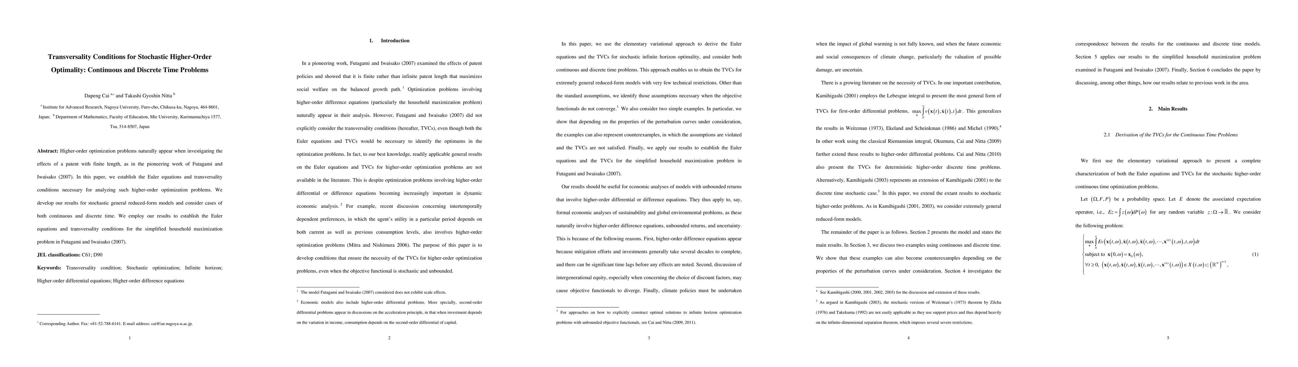 This paper establishes Euler equations and transversality conditions for higher-order stochastic optimization problems in both continuous and discrete time. It applies these results to analyze the household maximization problem in the context of patents, extending the work of Futagami and Iwaisako (2007).