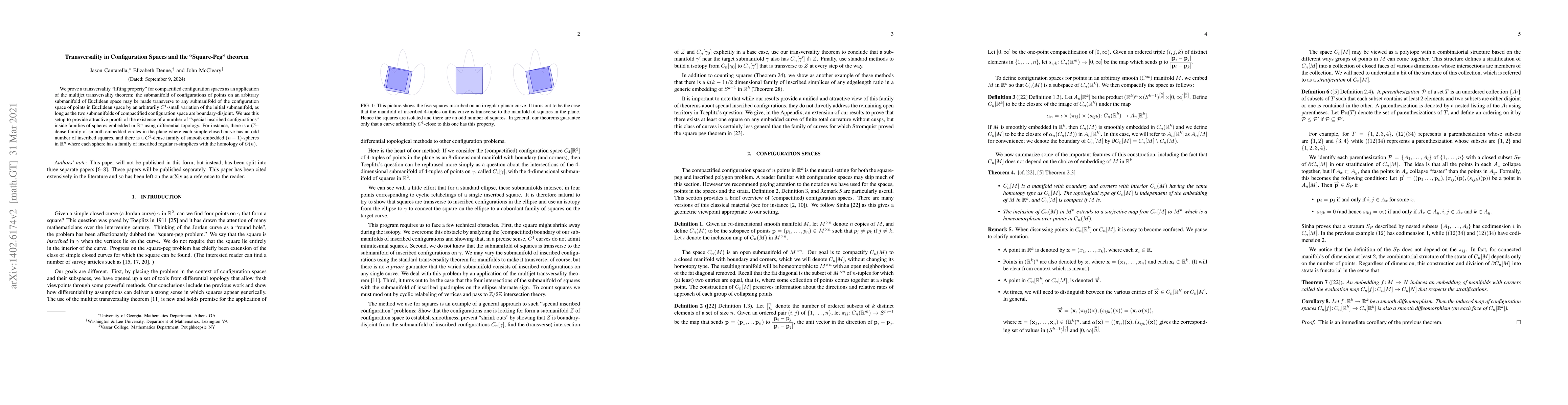 This paper proves a transversality lifting property for compactified configuration spaces, demonstrating that configurations can be made transverse to submanifolds by small variations, leading to proofs of the existence of special inscribed configurations such as odd-numbered inscribed squares in smooth embedded circles and regular simplices in spheres.