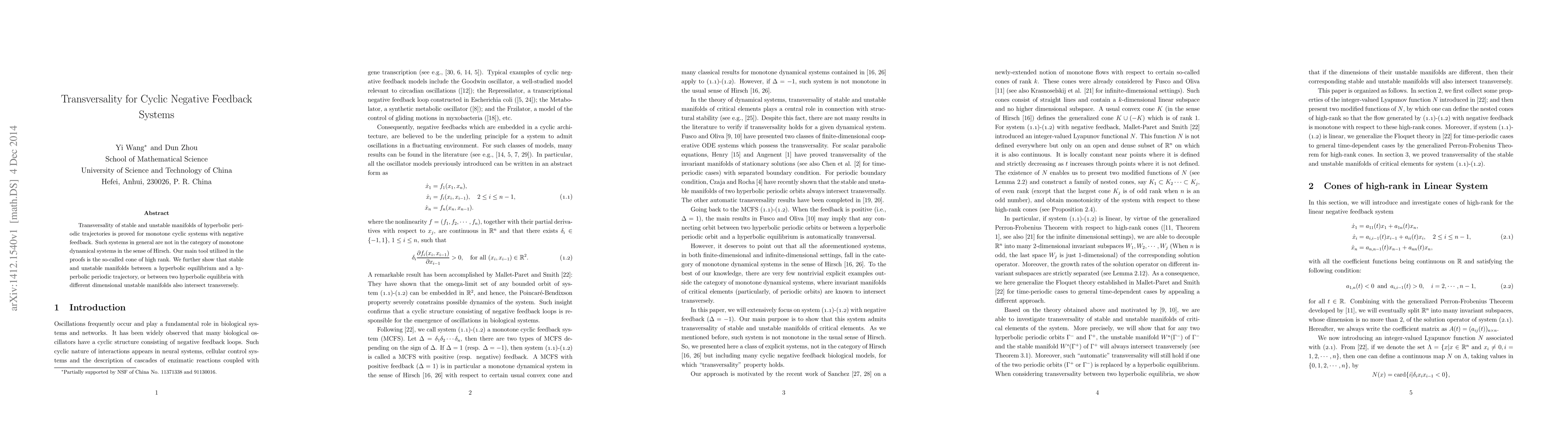 This paper proves transversality of stable and unstable manifolds for hyperbolic periodic trajectories in monotone cyclic negative feedback systems, using the concept of high rank cones. It also demonstrates transverse intersections between manifolds connecting hyperbolic equilibria and periodic trajectories.
