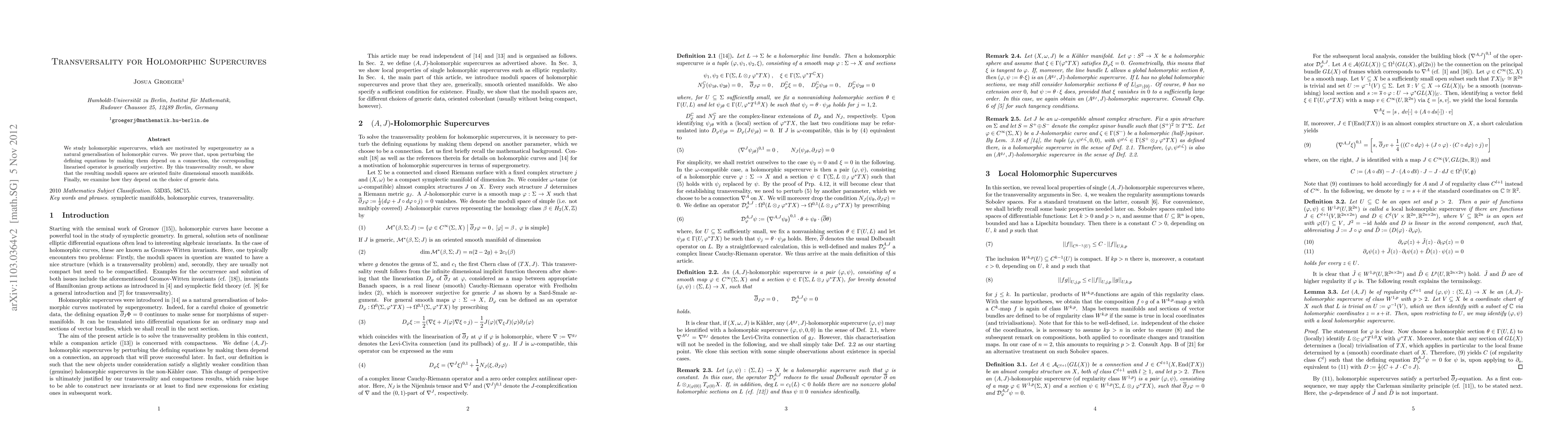 The paper investigates holomorphic supercurves and demonstrates transversality by proving the generic surjectivity of the linearized operator after perturbing their defining equations. This transversality leads to the conclusion that moduli spaces of these supercurves are smooth, finite-dimensional, and oriented manifolds.