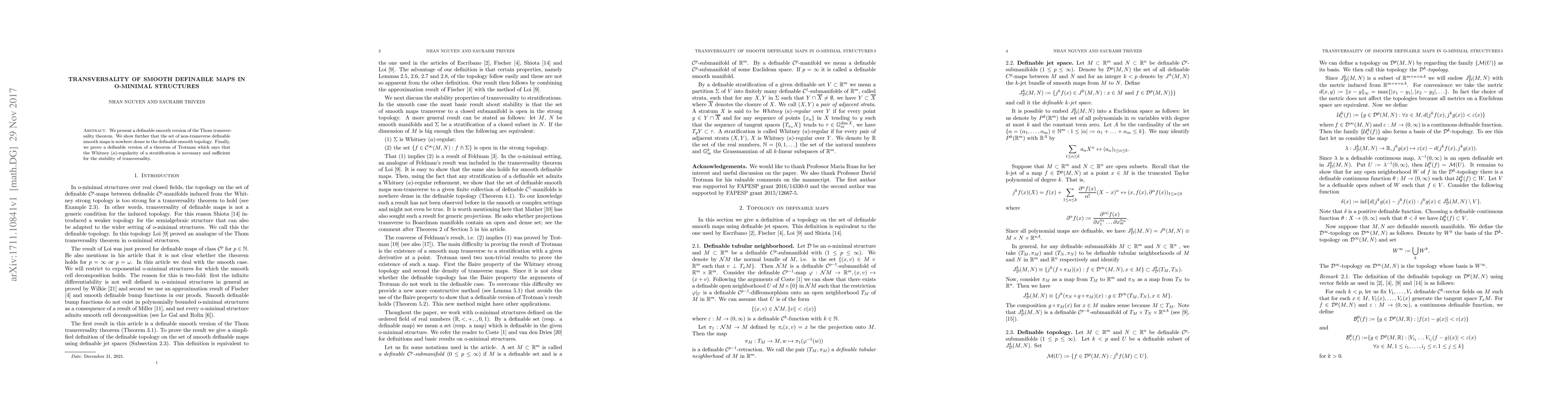 This paper establishes a definable smooth version of Thom's transversality theorem and proves that non-transverse definable smooth maps are nowhere dense. It also verifies Trotman's theorem in a definable context regarding the Whitney $(a)$-regularity and stability of transversality.