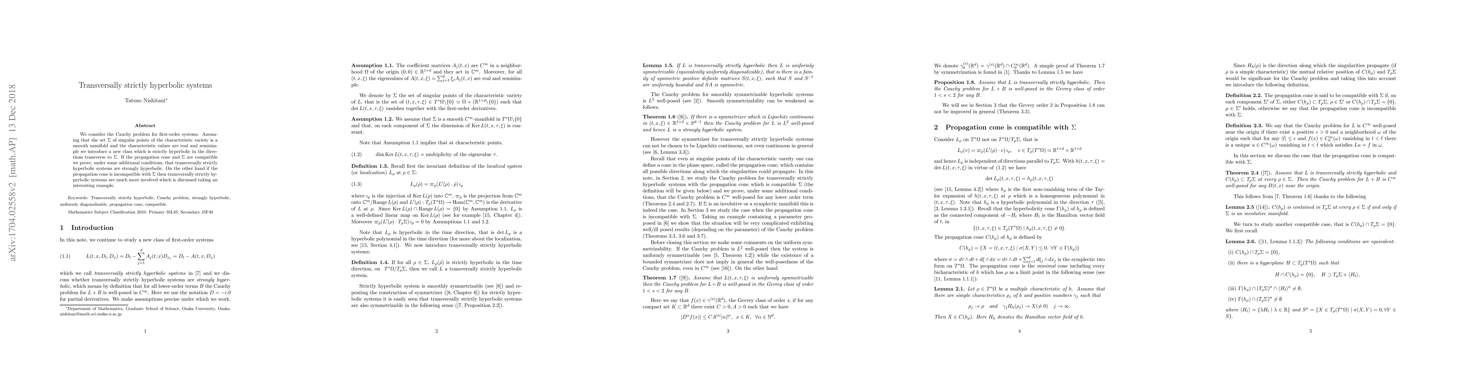 This paper introduces a new class of transversally strictly hyperbolic systems for first-order differential equations, proving strong hyperbolicity under certain conditions on the characteristic manifold. It also discusses the complexity of these systems when the manifold lacks involutive or symplectic properties, illustrated with an example.