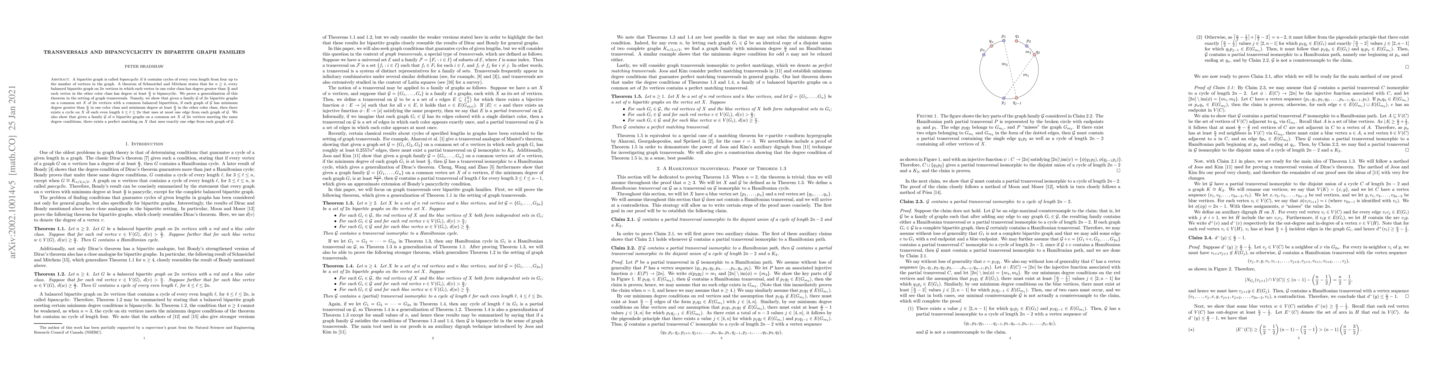 The paper generalizes a theorem on bipancyclicity in bipartite graphs to graph transversals, showing that there exists a cycle of every even length from 4 to 2n that uses at most one edge from each graph, and also proves the existence of a perfect matching with exactly one edge from each graph.