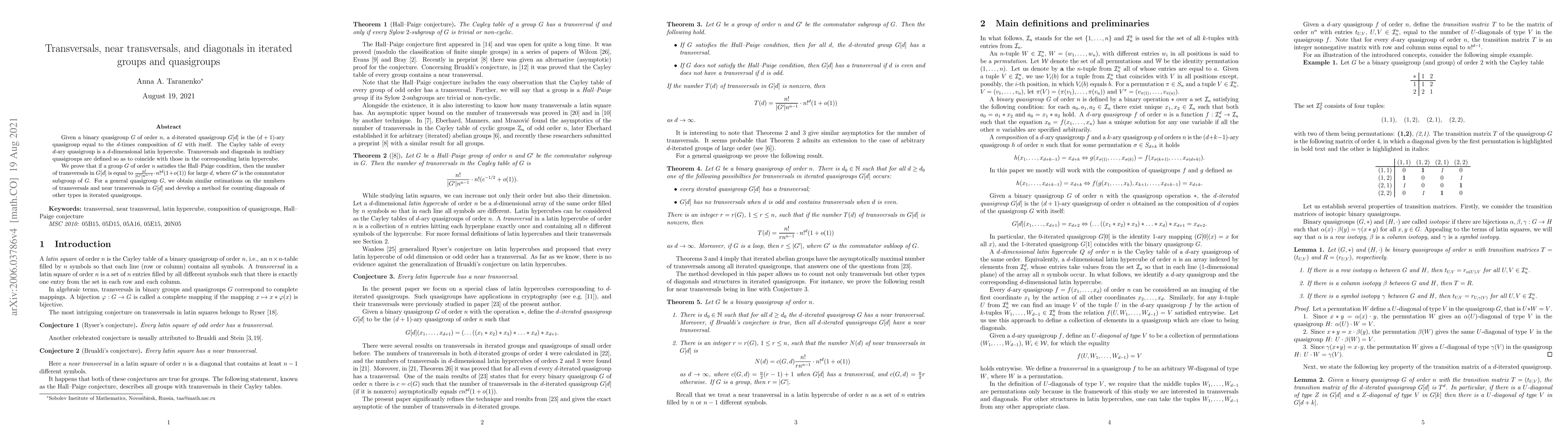 This paper investigates transversals, near transversals, and diagonals in iterated groups and quasigroups. It proves that for groups satisfying the Hall--Paige condition, the number of transversals in iterated quasigroups grows proportionally to $n!^{d}$ for large $d$, with a refined estimate involving the commutator subgroup. For general quasigroups, it provides similar estimations for transversals and near transversals and develops methods for counting different types of diagonals.