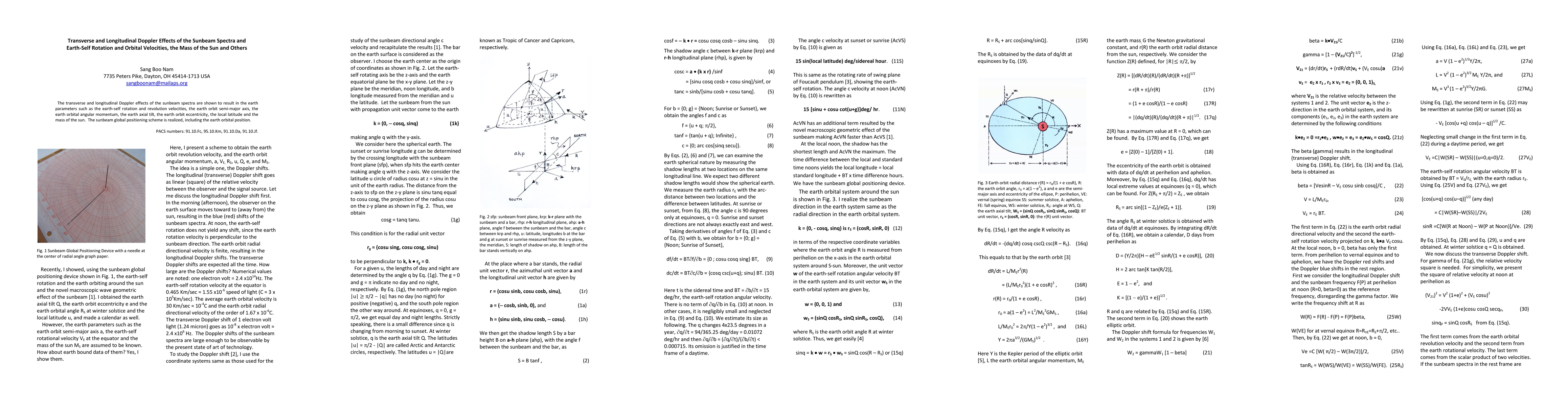 The transverse and longitudinal Doppler effects of the sunbeam spectra are shown to result in the earth parameters such as the earth-self rotation and revolution velocities, the earth orbit semi-major axis, the earth orbital angular momentum, the earth axial tilt, the earth orbit eccentricity, the local latitude and the mass of the sun. The sunbeam global positioning scheme is realized, including the earth orbital position. PACS numbers: 91.10.Fc, 95.10.Km, 91.10.Da, 91.10.Jf.