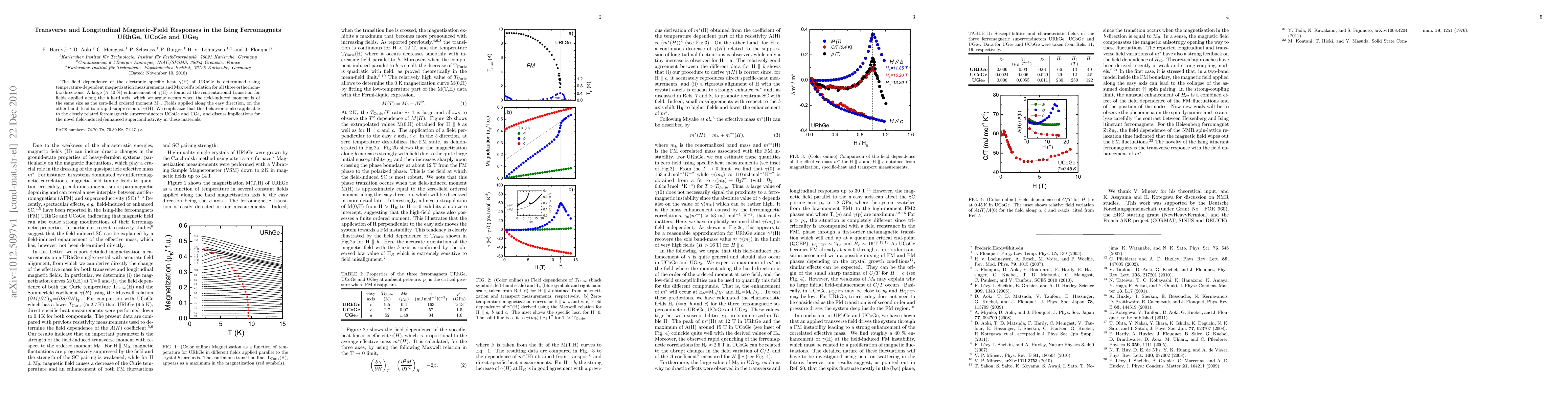 This study investigates the magnetic-field responses in Ising ferromagnets URhGe, UCoGe, and UGe2, finding a significant enhancement in electronic specific heat at the reorientational transition when fields are applied along the b hard axis. Conversely, fields along the easy direction rapidly suppress this specific heat, with implications for field-induced superconductivity in these materials.