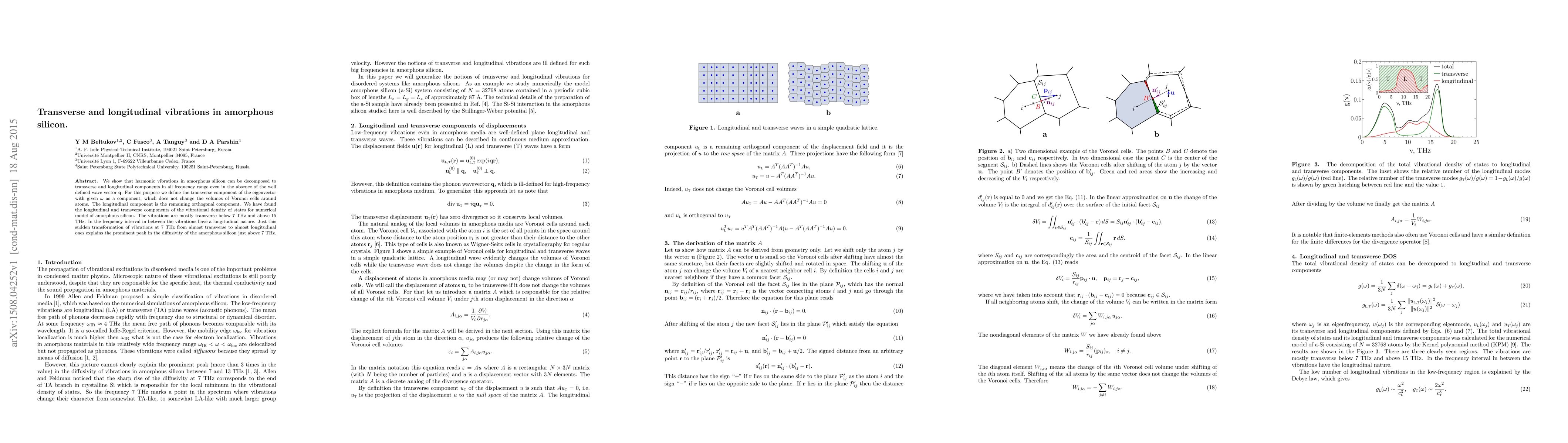 This paper decomposes harmonic vibrations in amorphous silicon into transverse and longitudinal components across all frequencies, revealing that vibrations are predominantly transverse below 7 THz and above 15 THz, while becoming longitudinal in between. The transition at 7 THz explains a peak in the material's diffusivity.