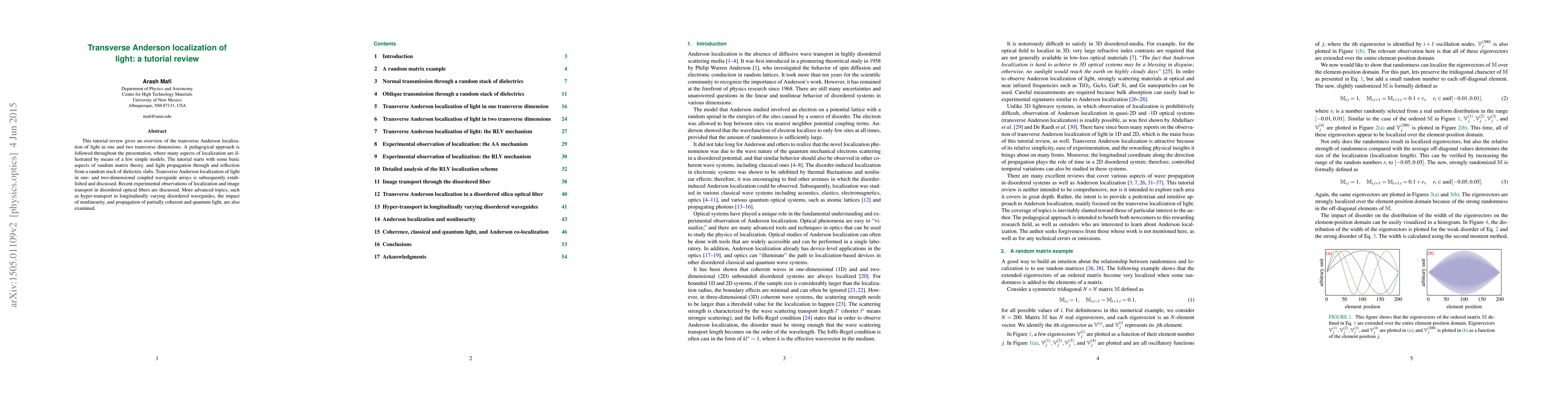 This tutorial review provides a comprehensive overview of transverse Anderson localization of light, focusing on simple models to illustrate one- and two-dimensional localization phenomena. It covers recent experimental observations and explores advanced topics including nonlinear effects and the propagation of quantum light.
