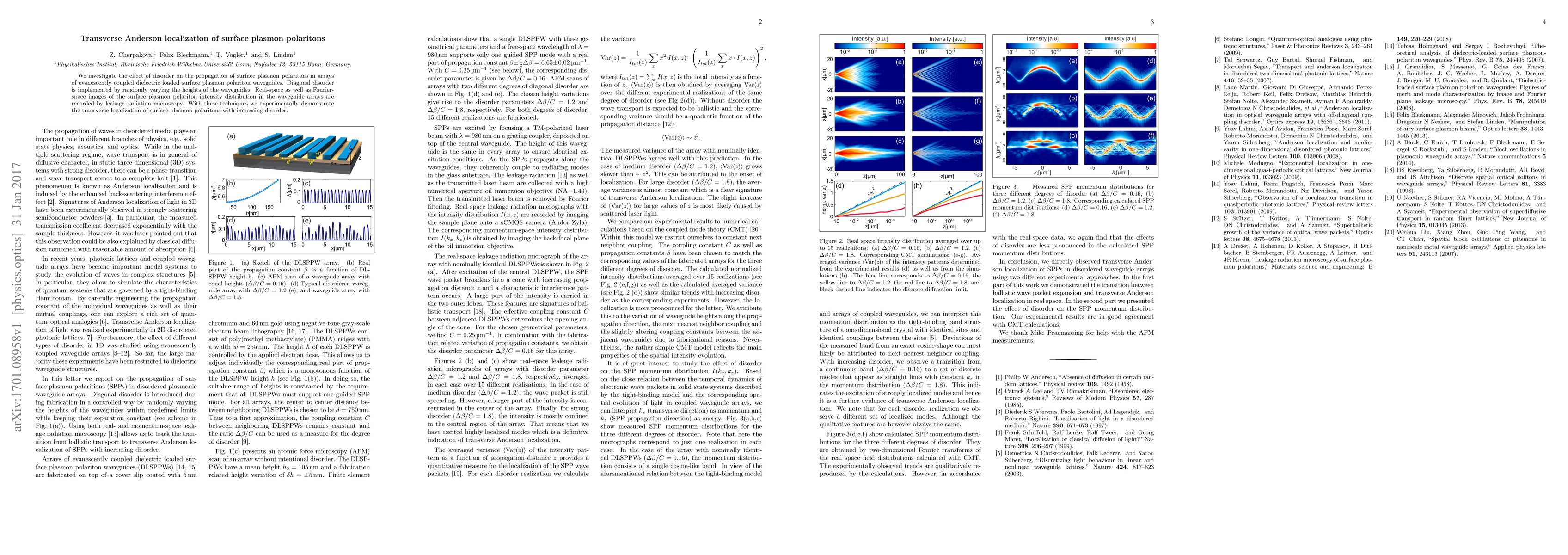 Development of a method to study transverse Anderson localization of SPPs in disordered plasmonic waveguide arrays using leakage radiation microscopy and coupled mode theory.