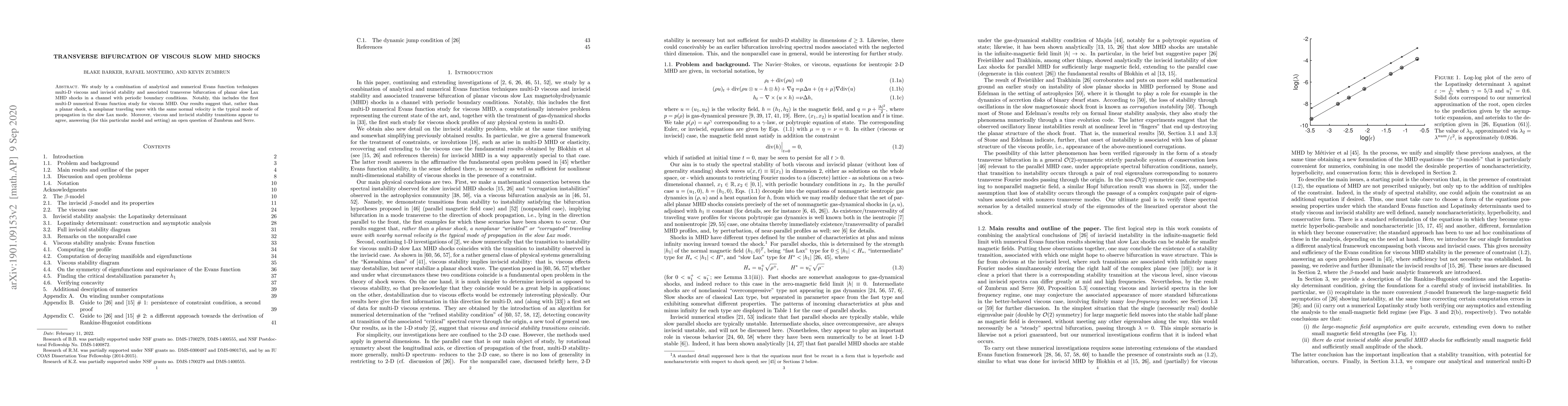 This paper investigates the multi-dimensional stability and transverse bifurcation of planar slow magnetohydrodynamic (MHD) shocks using analytical and numerical Evans function techniques. The findings suggest that nonplanar traveling waves, rather than planar shocks, are the typical mode of propagation, and that viscous and inviscid stability transitions align, resolving an open question in the field.