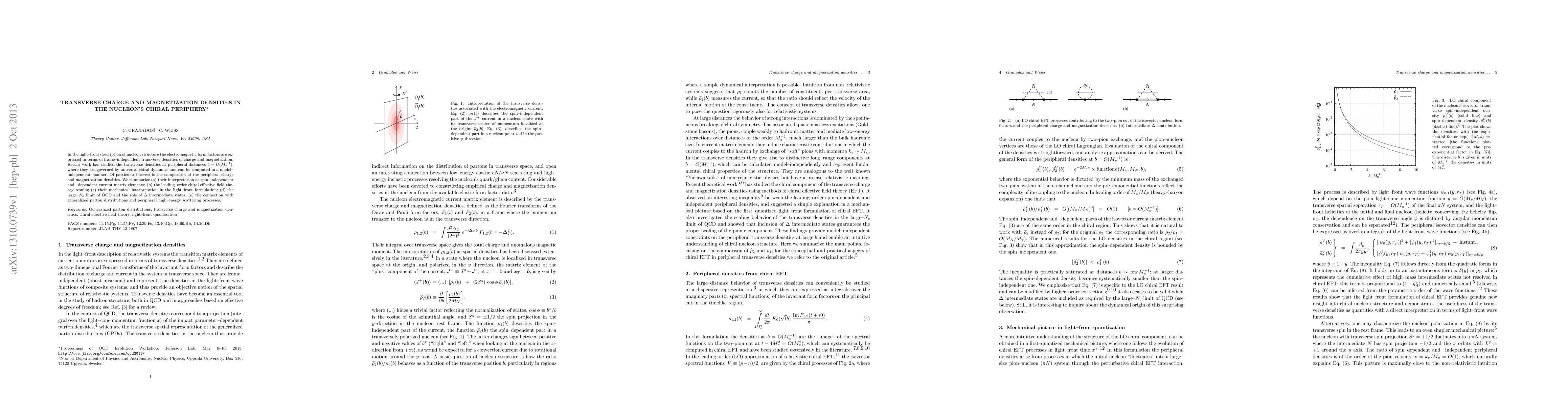 This paper investigates the transverse charge and magnetization densities in the nucleon's chiral periphery, focusing on their interpretation as spin-independent and -dependent current matrix elements, and their connection with generalized parton distributions and high-energy scattering processes. It also explores their computation via leading-order chiral effective field theory and the role of Delta intermediate states in the large-N_c limit of QCD.
