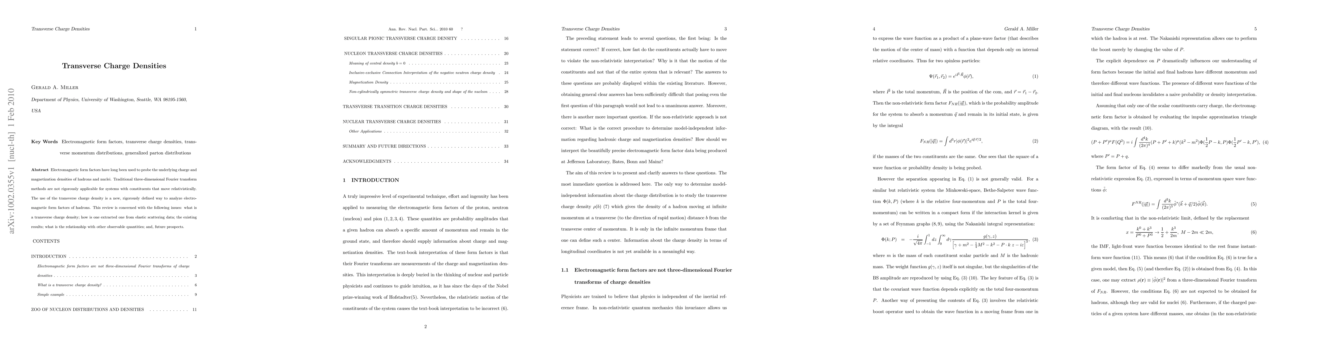 This paper reviews the concept of transverse charge densities as a new method for analyzing electromagnetic form factors of hadrons, replacing traditional Fourier transform approaches. It discusses extraction from elastic scattering data, existing results, and future prospects.