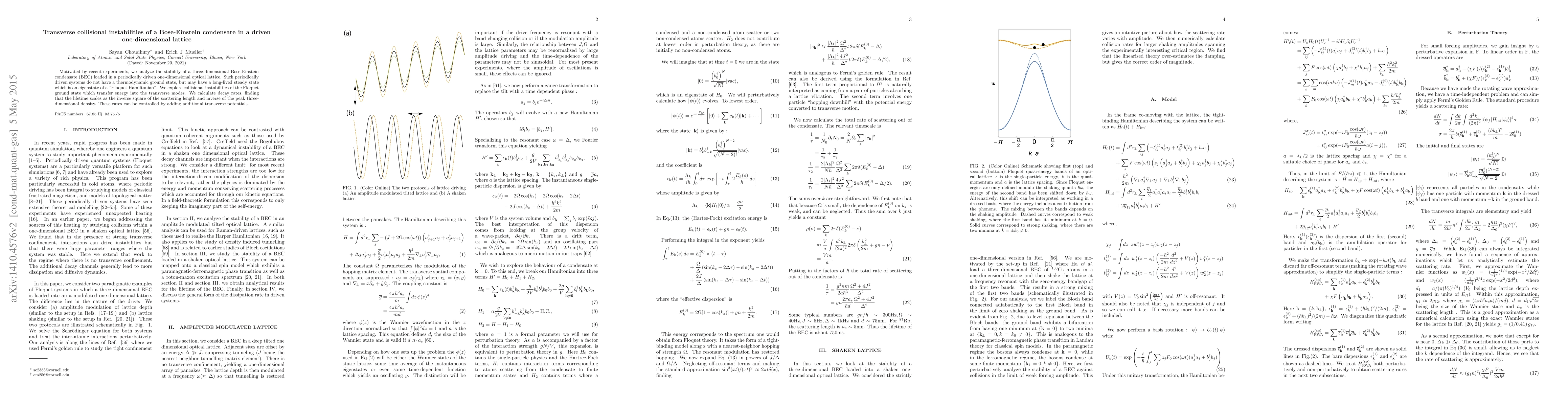 This paper investigates the stability of a Bose-Einstein condensate in a periodically driven one-dimensional optical lattice, focusing on transverse collisional instabilities that transfer energy into transverse modes. The study finds that the instability decay rates are inversely proportional to the square of the scattering length and the peak density, with potential for control via additional transverse potentials.