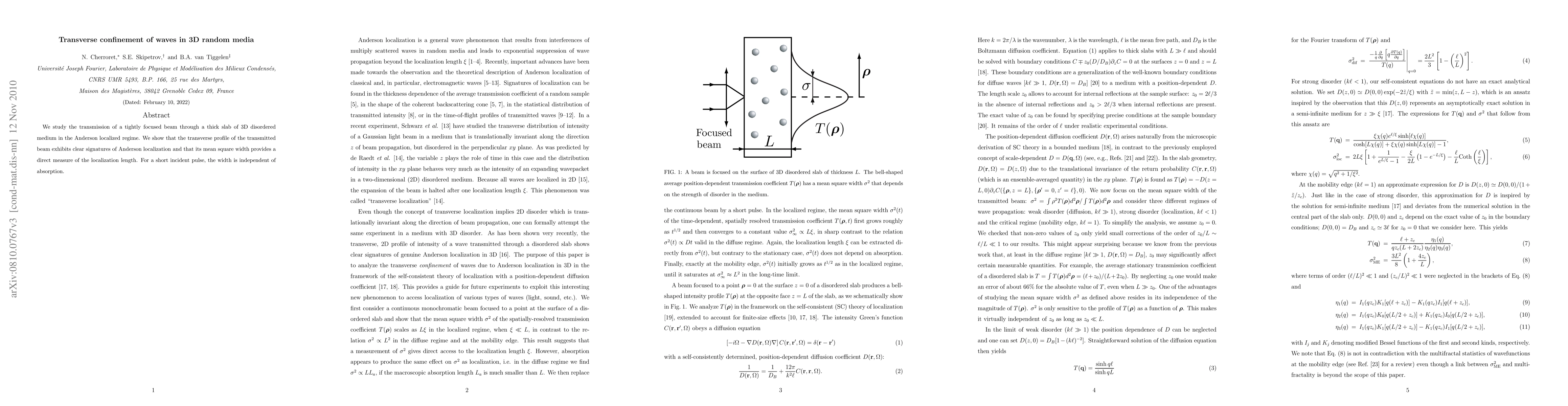 Summary: This research investigates the transmission of a focused beam through a 3D disordered medium, demonstrating that the transmitted beam's transverse profile shows signs of Anderson localization, with its mean square width directly measuring the localization length, independent of absorption for short pulses.