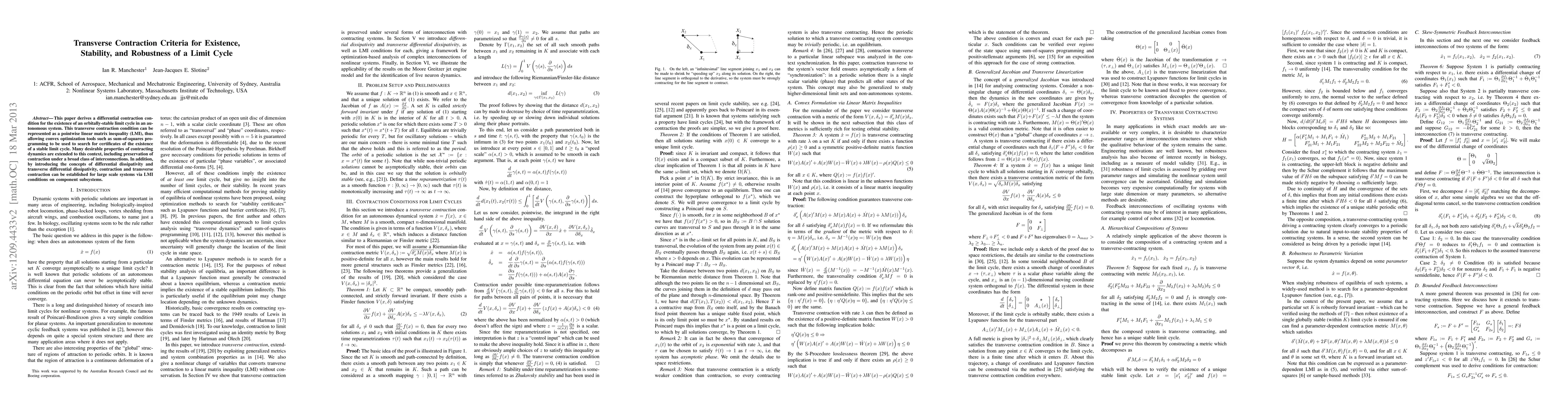 This paper derives a differential contraction condition for the existence of an orbitally-stable limit cycle in an autonomous system. This transverse contraction condition can be represented as a pointwise linear matrix inequality (LMI), thus allowing convex optimization tools such as sum-of-squares programming to be used to search for certificates of the existence of a stable limit cycle. Many desirable properties of contracting dynamics are extended to this context, including preservation of contraction under a broad class of interconnections. In addition, by introducing the concepts of differential dissipativity and transverse differential dissipativity, contraction and transverse contraction can be established for large scale systems via LMI conditions on component subsystems.