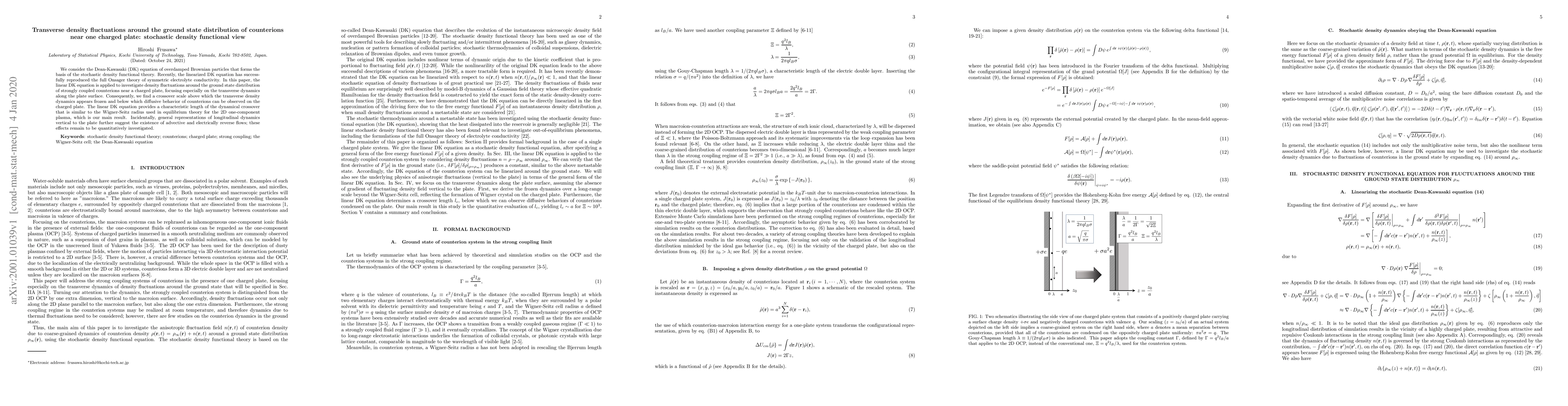 We consider the Dean-Kawasaki (DK) equation of overdamped Brownian particles that forms the basis of the stochastic density functional theory. Recently, the linearized DK equation has successfully reproduced the full Onsager theory of symmetric electrolyte conductivity. In this paper, the linear DK equation is applied to investigate density fluctuations around the ground state distribution of strongly coupled counterions near a charged plate, focusing especially on the transverse dynamics along the plate surface. Consequently, we find a crossover scale above which the transverse density dynamics appears frozen and below which diffusive behavior of counterions can be observed on the charged plate. The linear DK equation provides a characteristic length of the dynamical crossover that is similar to the Wigner-Seitz radius used in equilibrium theory for the 2D one-component plasma, which is our main result. Incidentally, general representations of longitudinal dynamics vertical to the plate further suggest the existence of advective and electrically reverse flows; these effects remain to be quantitatively investigated.