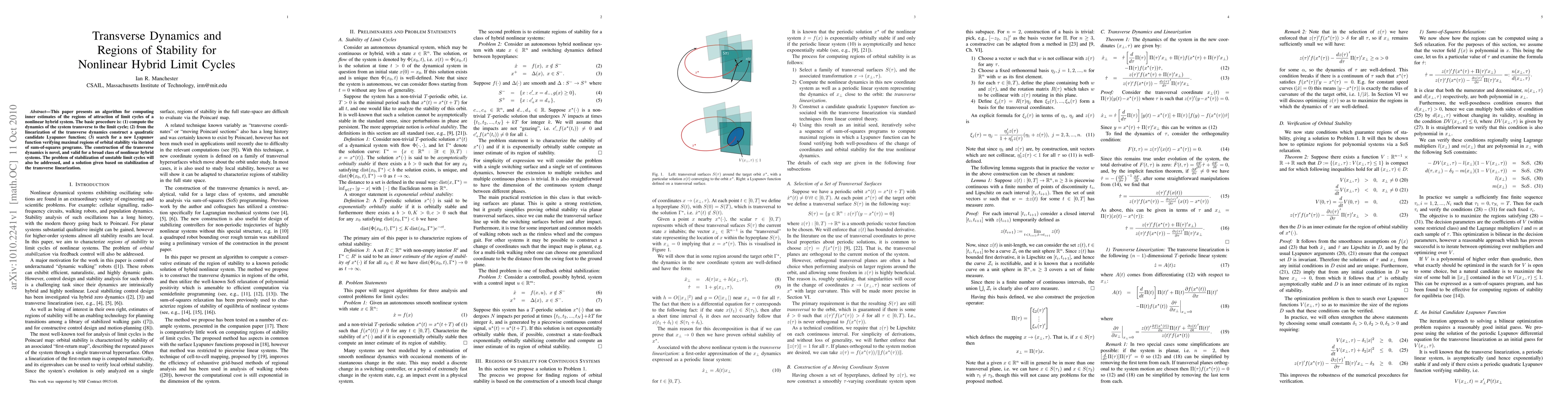 This paper develops an algorithm to estimate regions of attraction for nonlinear hybrid systems' limit cycles by computing transverse dynamics, constructing a quadratic Lyapunov function, and using sum-of-squares programs to find maximal stability regions. The method also addresses stabilization of unstable limit cycles through the transverse linearization.
