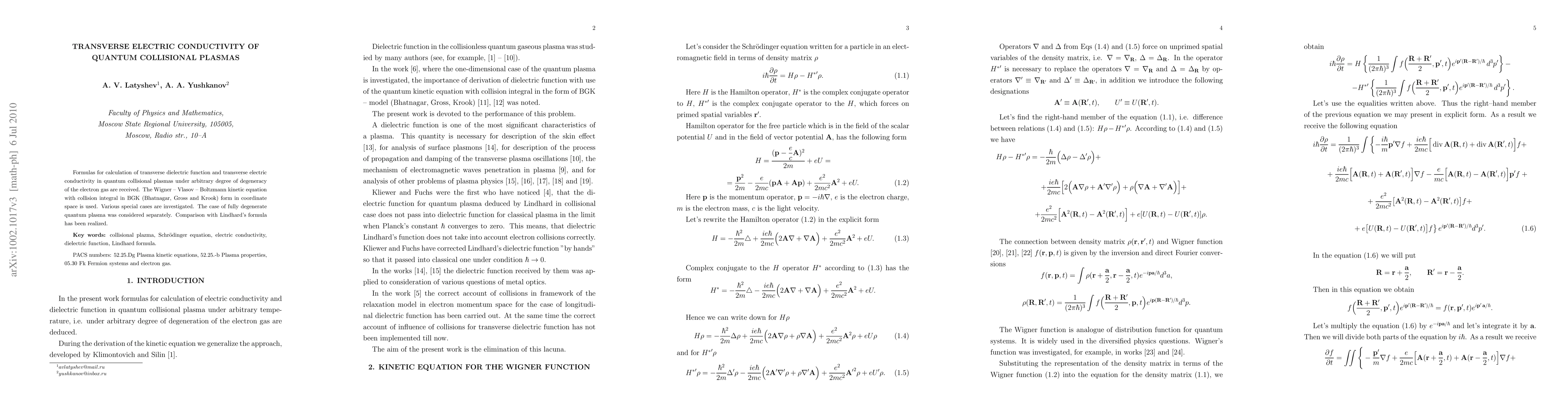 Formulas for calculation of transverse dielectric function and transverse electric conductivity in quantum collisional plasmas under arbitrary degree of degeneracy of the electron gas are received. The Wigner - Vlasov - Boltzmann kinetic equation with collision integral in BGK (Bhatnagar, Gross and Krook) form in coordinate space is used. Various special cases are investigated. The case of fully degenerate quantum plasma was considered separately. Comparison with Lindhard's formula has been realized.