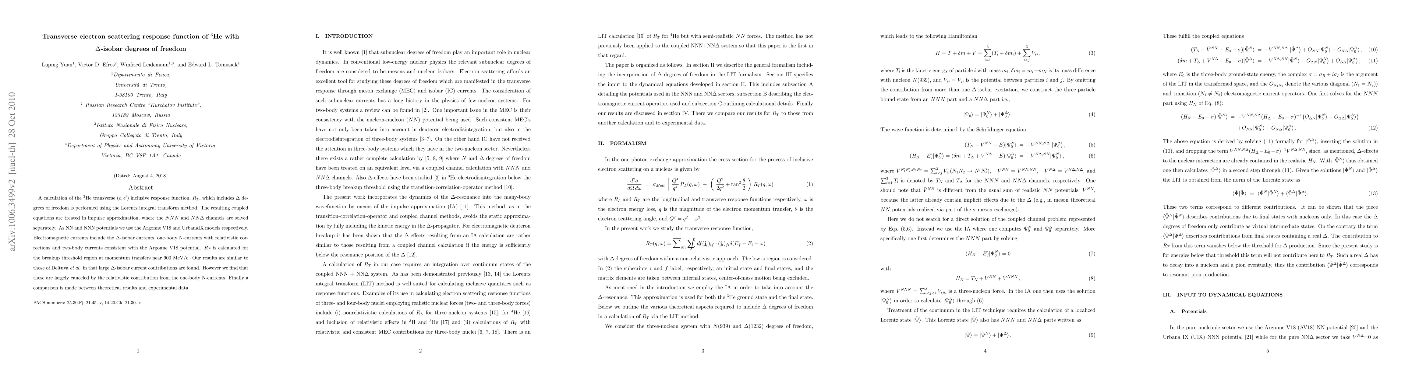 This paper calculates the transverse electron scattering response function $R_T$ for $^3$He, incorporating $\Delta$-isobar degrees of freedom, using the Lorentz integral transform method and solving coupled equations in impulse approximation. The results show significant $\Delta$-isobar current contributions, which are largely canceled by relativistic one-body N-currents, and are compared to experimental data.