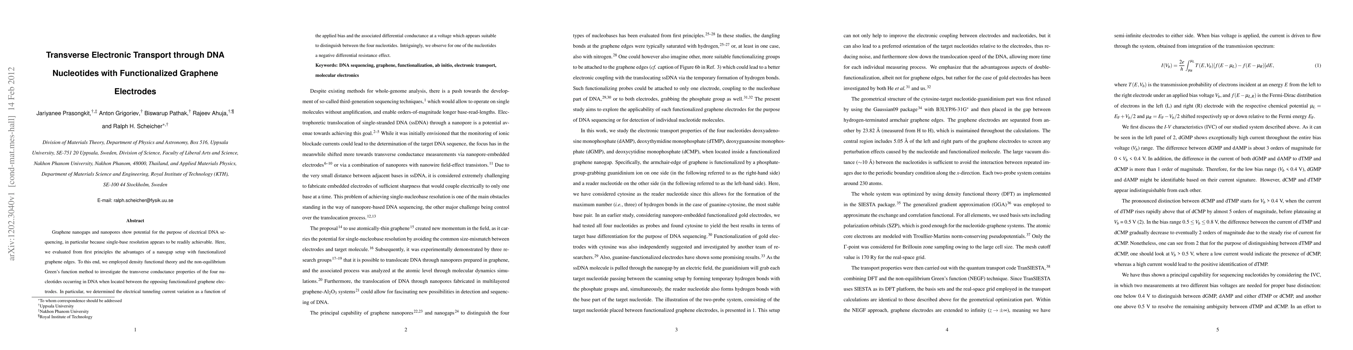 This paper investigates the transverse electronic transport through DNA nucleotides using functionalized graphene electrodes, employing density functional theory and non-equilibrium Green's function methods. The study reveals distinct conductance properties for each nucleotide, with a notable negative differential resistance effect observed for one nucleotide.