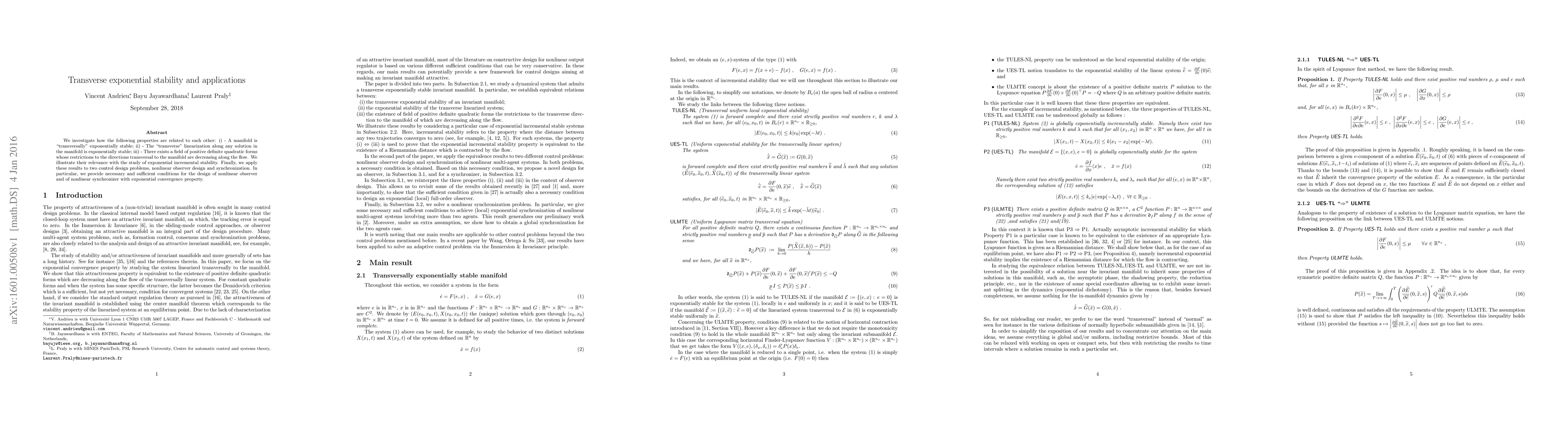 We investigate how the following properties are related to each other: i)-A manifold is "transversally" exponentially stable; ii)-The "transverse" linearization along any solution in the manifold is exponentially stable; iii)-There exists a field of positive definite quadratic forms whose restrictions to the directions transversal to the manifold are decreasing along the flow. We illustrate their relevance with the study of exponential incremental stability. Finally, we apply these results to two control design problems, nonlinear observer design and synchronization. In particular, we provide necessary and sufficient conditions for the design of nonlinear observer and of nonlinear synchronizer with exponential convergence property.