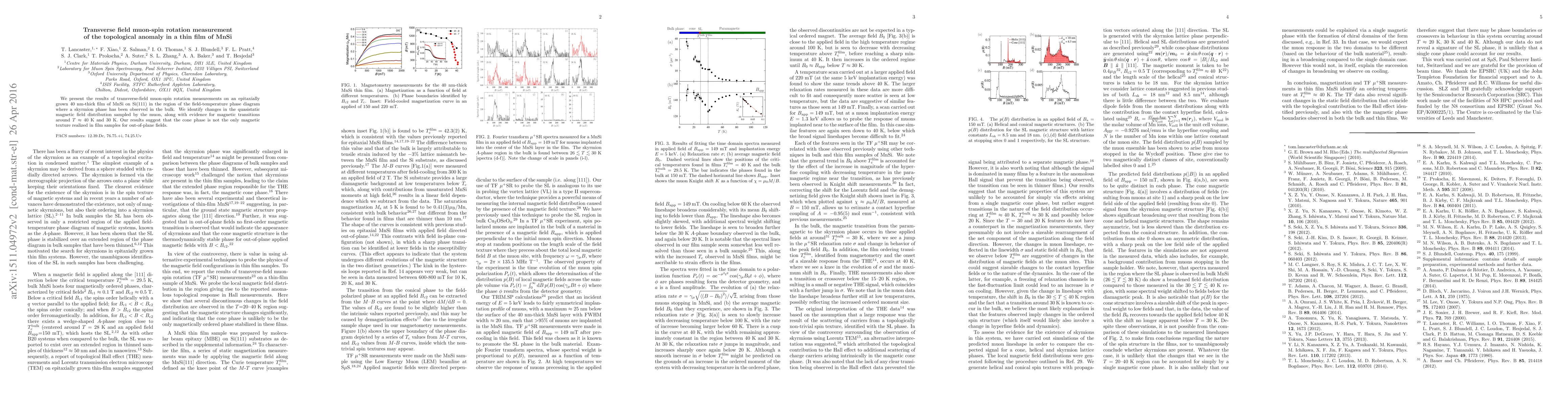 We present the results of transverse-field muon-spin rotation measurements on an epitaxially grown 40 nm-thick film of MnSi on Si(111) in the region of the field-temperature phase diagram where a skyrmion phase has been observed in the bulk. We identify changes in the quasistatic magnetic field distribution sampled by the muon, along with evidence for magnetic transitions around $T\approx 40$ K and 30 K. Our results suggest that the cone phase is not the only magnetic texture realized in film samples for out-of-plane fields.