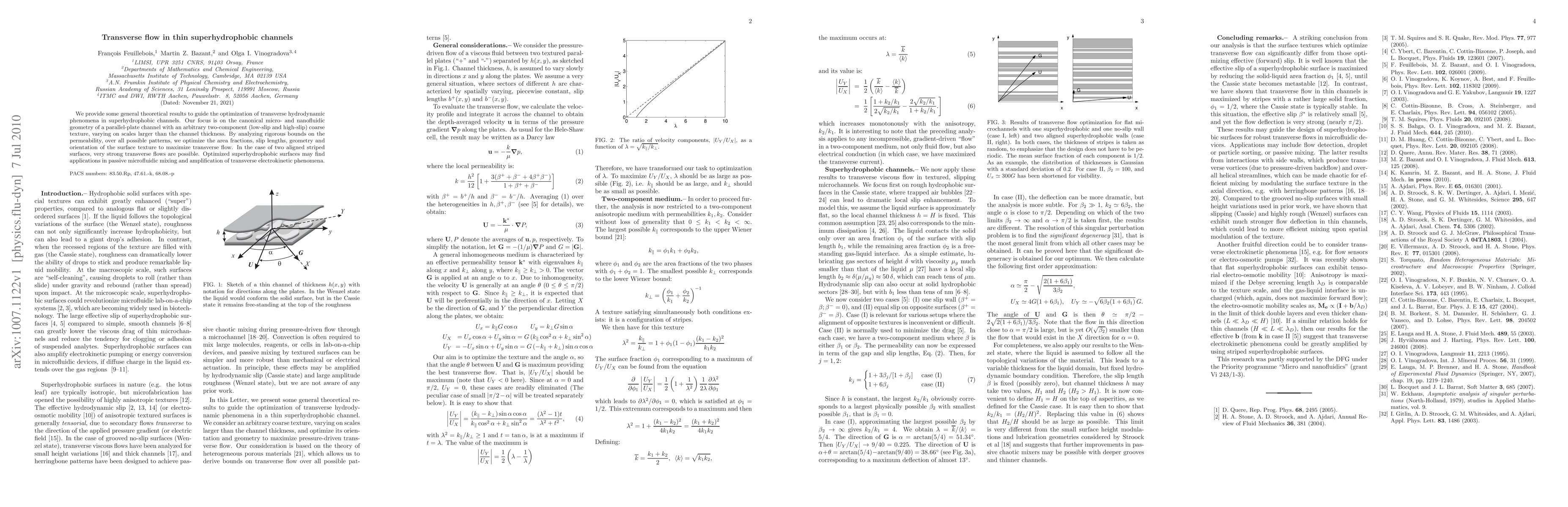 This paper presents theoretical results to optimize transverse hydrodynamic flow in superhydrophobic channels, focusing on maximizing flow through textured surfaces. The study finds that aligned striped textures can generate strong transverse flows, with potential applications in passive microfluidic mixing and enhancing electrokinetic effects.