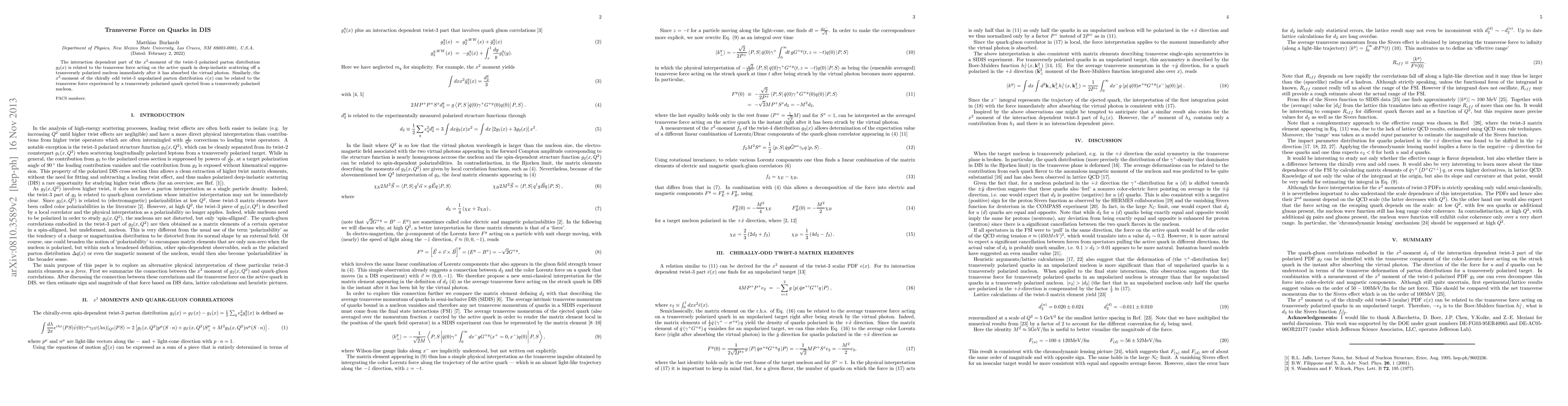 This paper investigates the transverse force on quarks in deep-inelastic scattering (DIS), linking the $x^2$-moment of twist-3 polarized parton distribution $g_2(x)$ to the force on an active quark after absorbing a virtual photon, and relating $x^2$-moment of $e(x)$ to the force on a ejected quark.