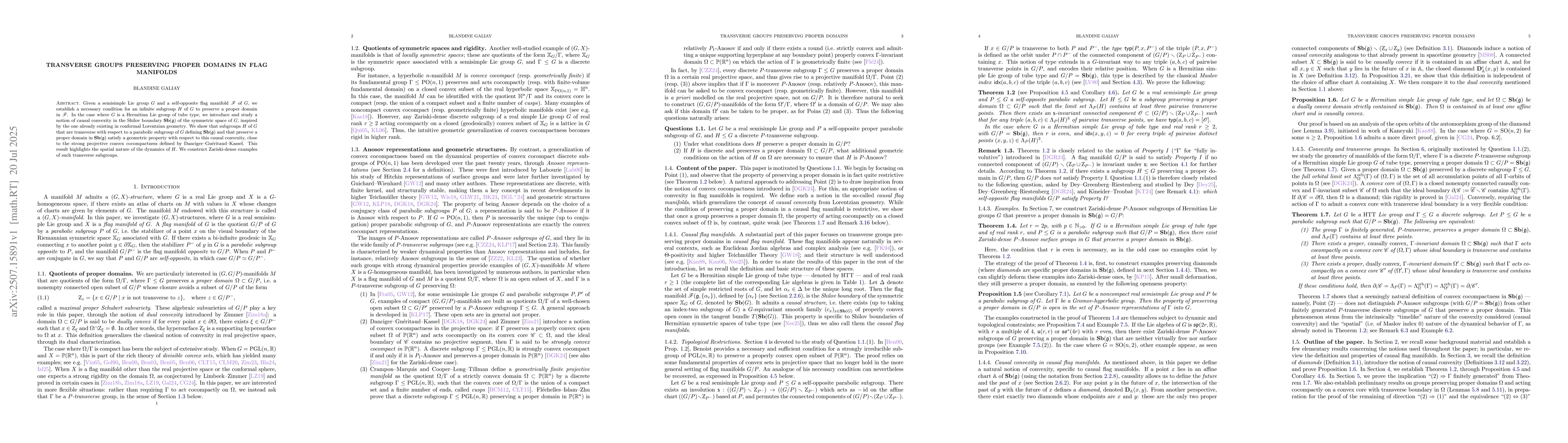 Given a semisimple Lie group $G$ and a self-opposite flag manifold $\mathcal{F}$ of $G$, we establish a necessary condition for an infinite subgroup $H$ of $G$ to preserve a proper domain in $\mathcal{F}$. In the case where $G$ is a Hermitian Lie group of tube type, we introduce and study a notion of causal convexity in the Shilov boundary $\mathbf{Sb}(G)$ of the symmetric space of $G$, inspired by the one already existing in conformal Lorentzian geometry. We show that subgroups $H$ of $G$ that are transverse with respect to a parabolic subgroup of $G$ defining $\mathbf{Sb}(G)$ and that preserve a proper domain in $\mathbf{Sb}(G)$ satisfy a geometric property with respect to this causal convexity, close to the strong projective convex cocompactness defined by Danciger--Gu\'eritaud--Kassel. This result highlights the spatial nature of the dynamics of $H$. We construct Zariski-dense examples of such transverse subgroups.